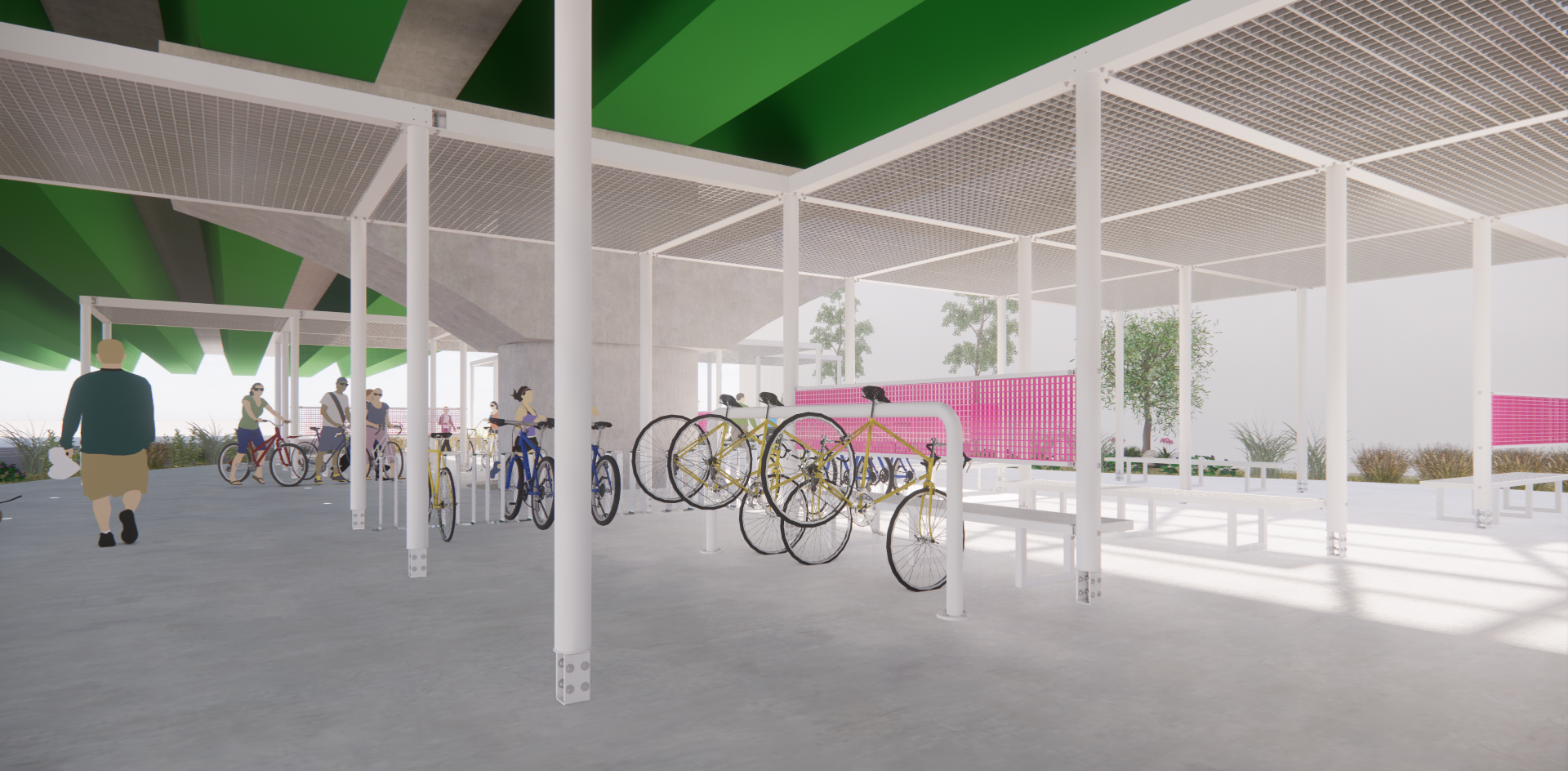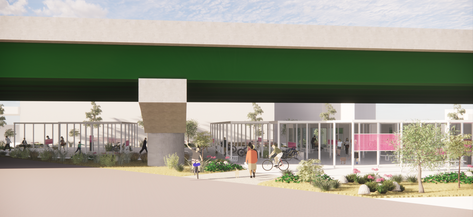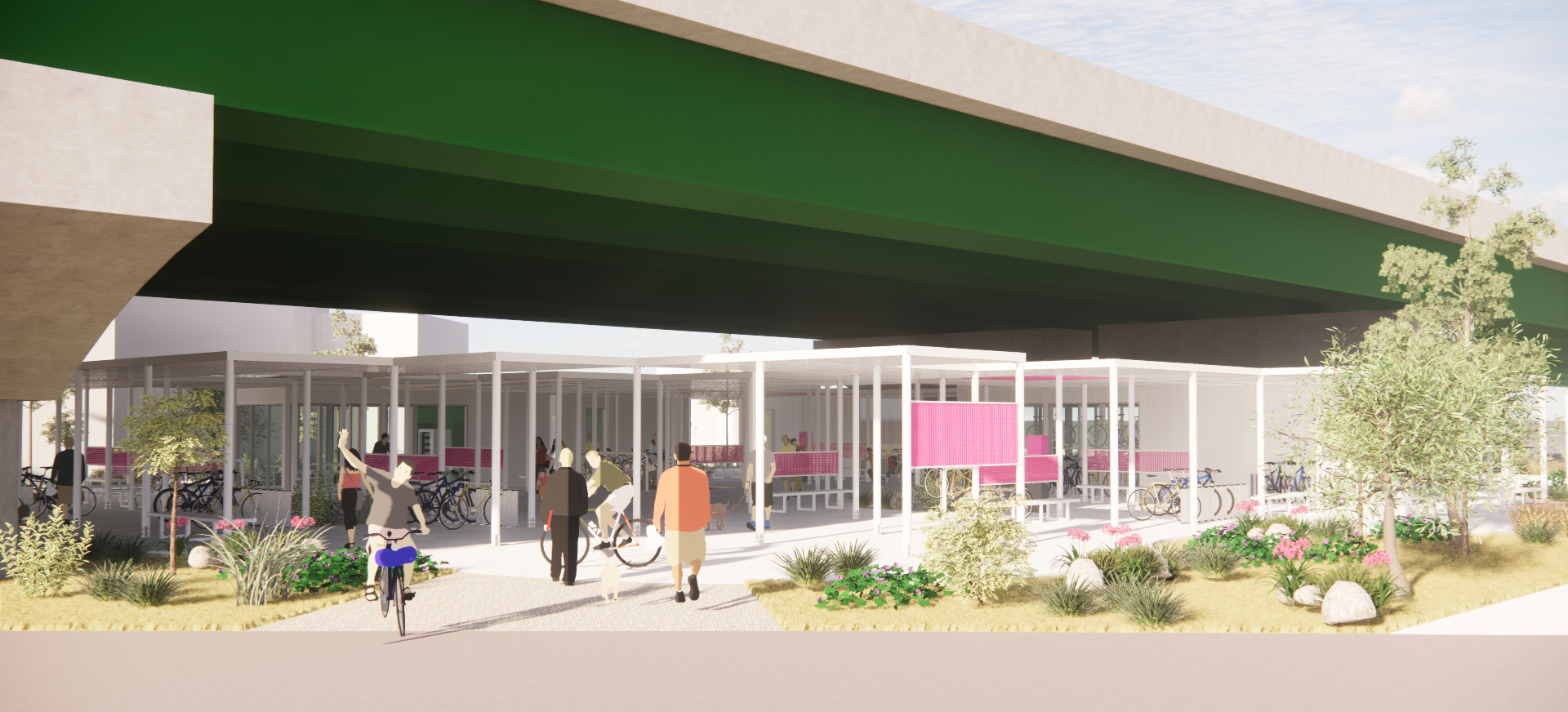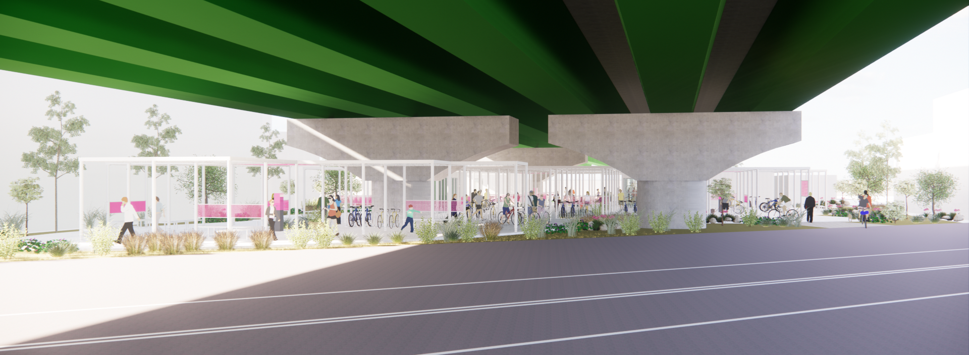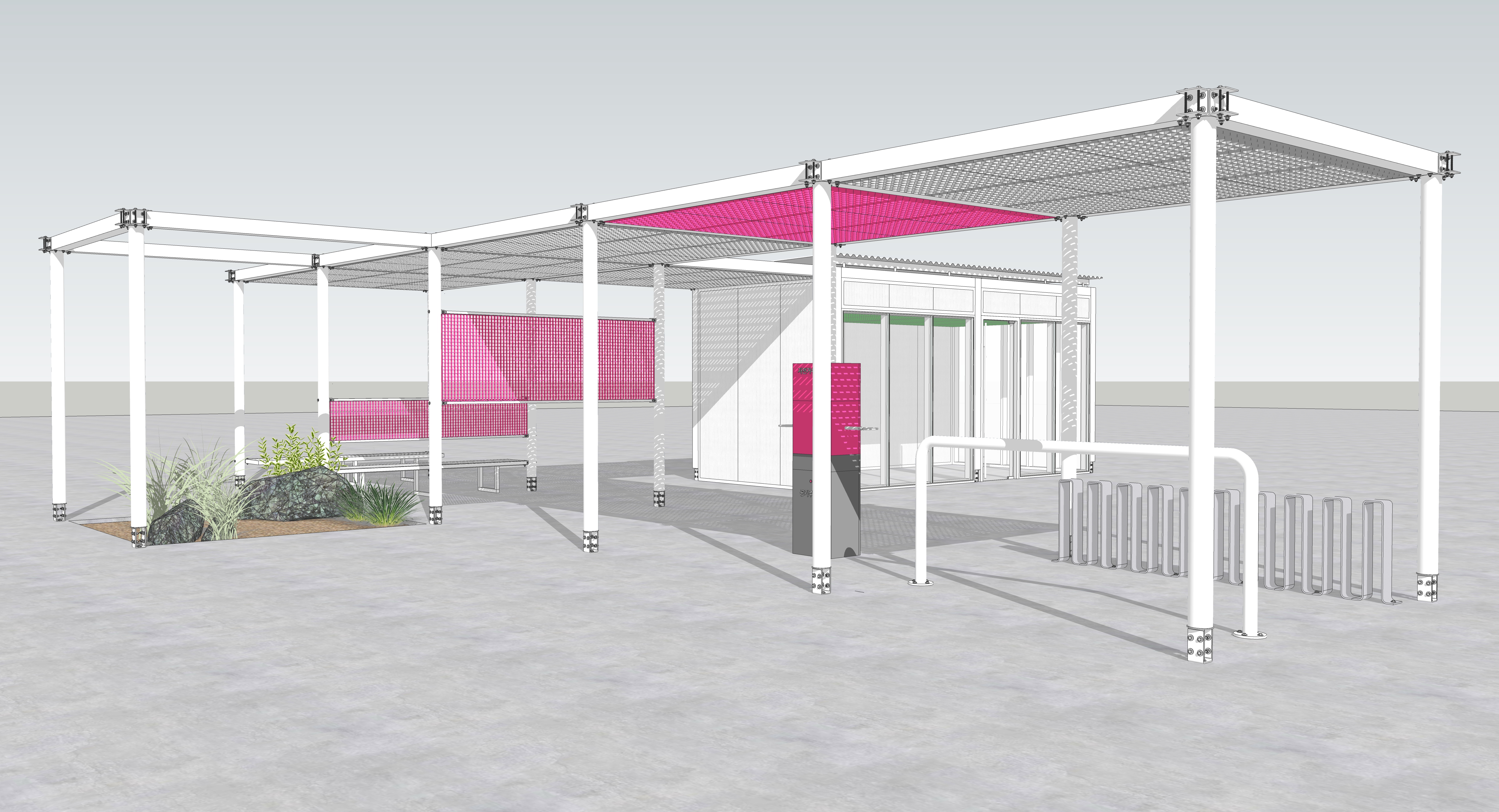 주변과는 다른 공간이라는 이미지, 어두운 고가 하부가 아니라 밝은 공간이라는 이미지가 필요하며, 길 건너 자전거길 이용자들에게도 존재감을 어필하고 이리오라 유혹할 수 있는 이미지로 존재해야 하는 환경의 시설이다.