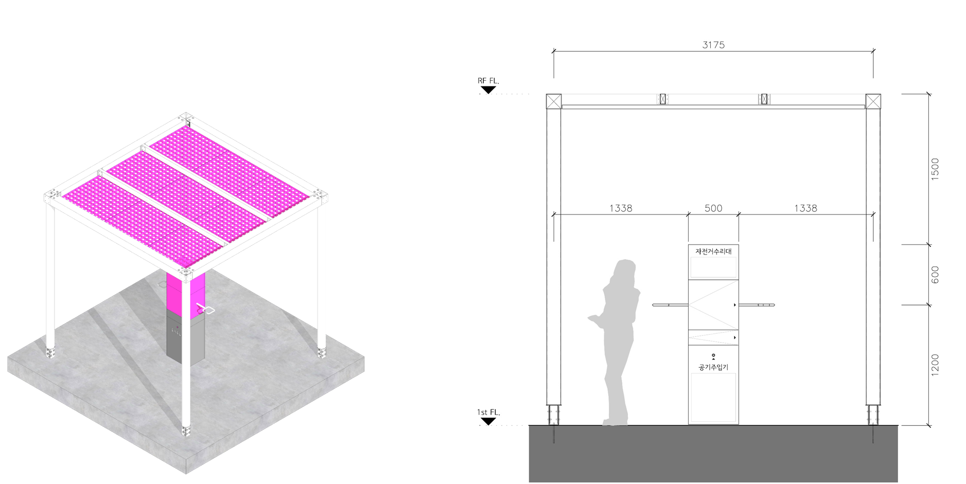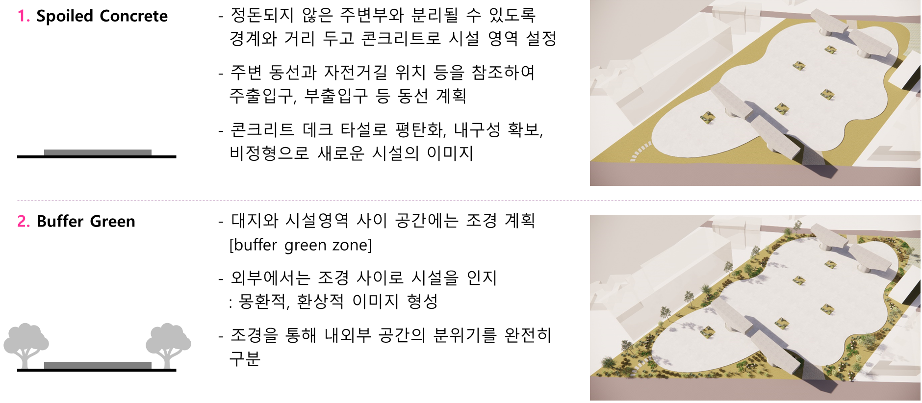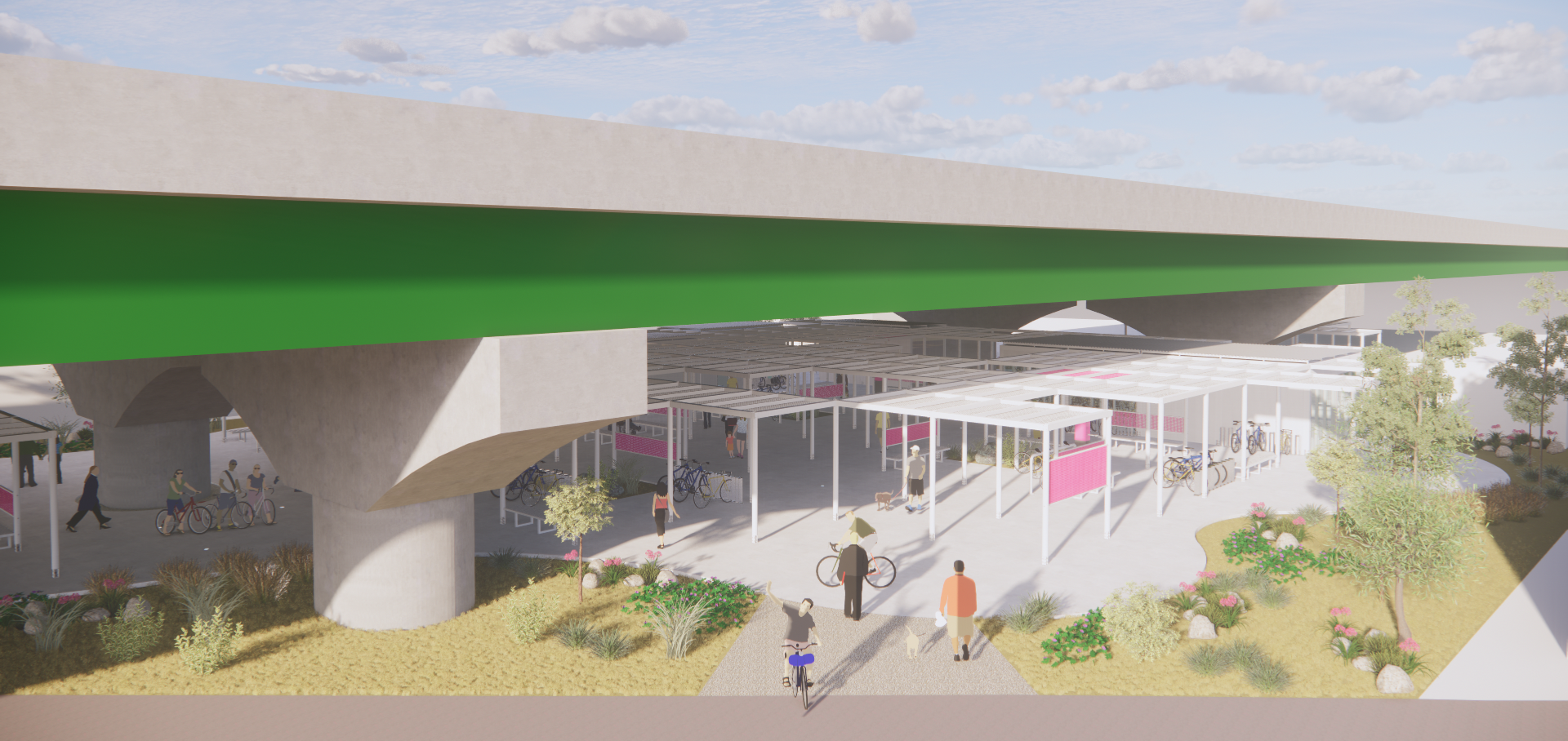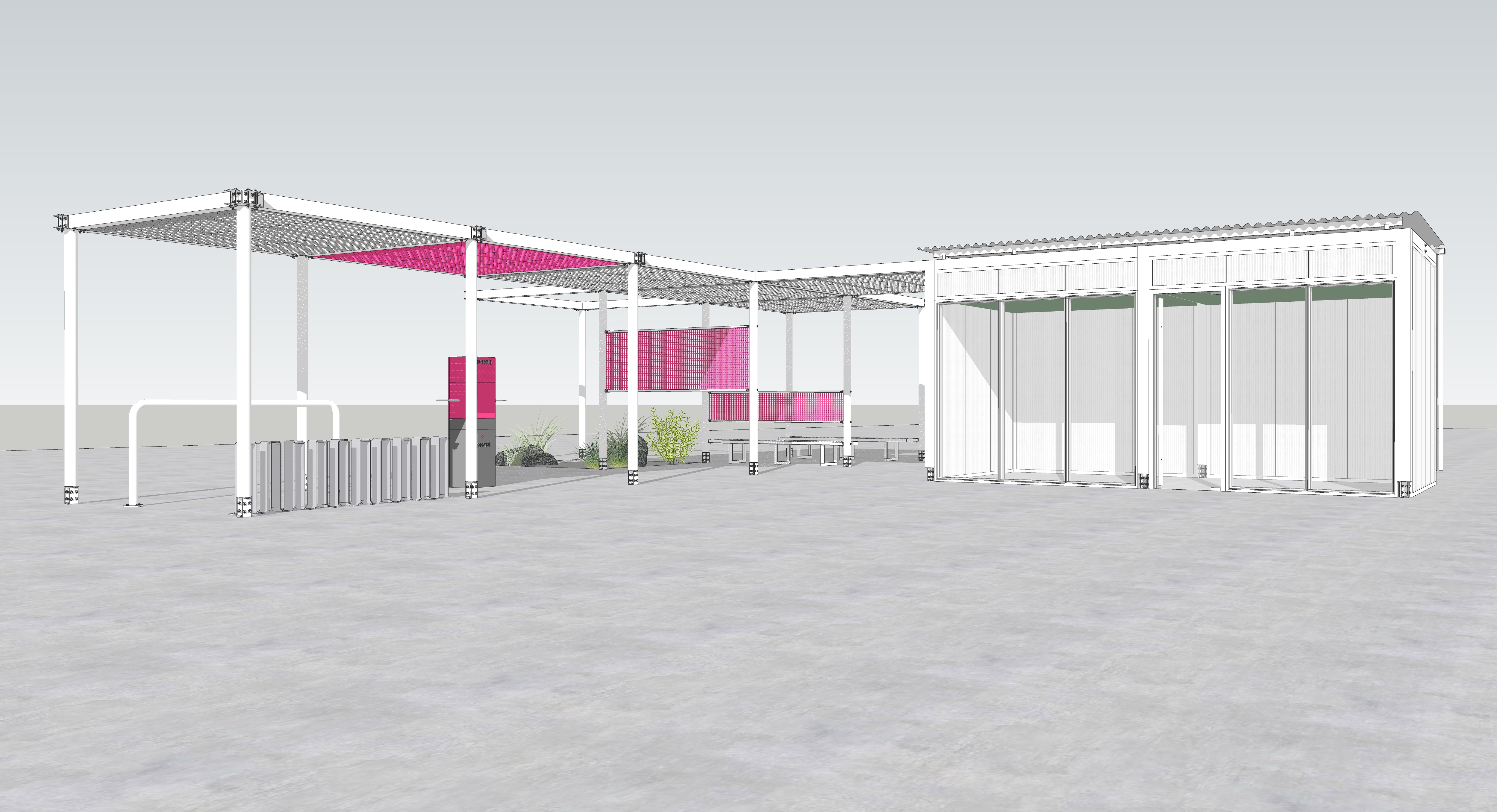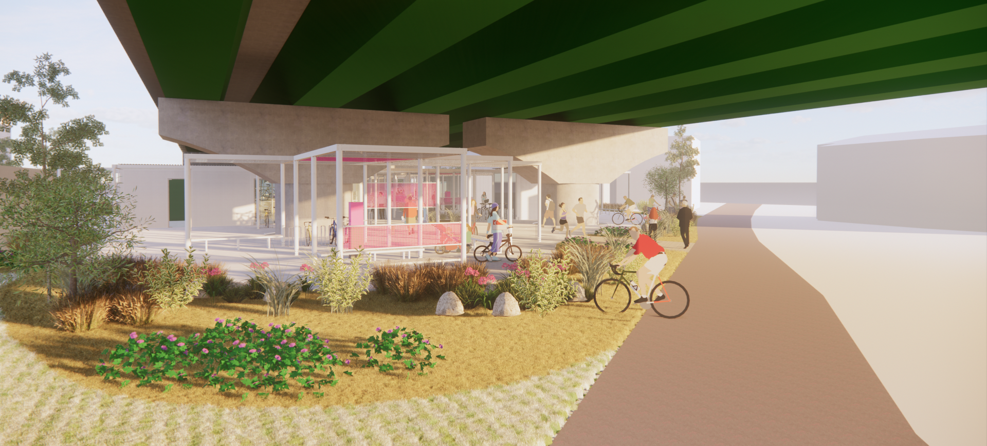 주변과는 다른 공간이라는 이미지, 어두운 고가 하부가 아니라 밝은 공간이라는 이미지가 필요하며, 길 건너 자전거길 이용자들에게도 존재감을 어필하고 이리오라 유혹할 수 있는 이미지로 존재해야 하는 환경의 시설이다.