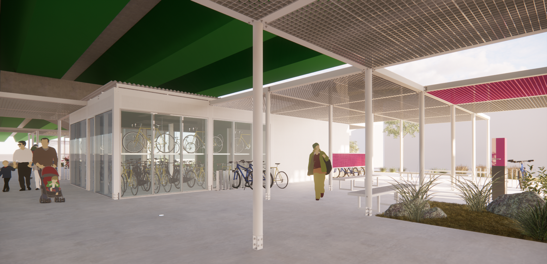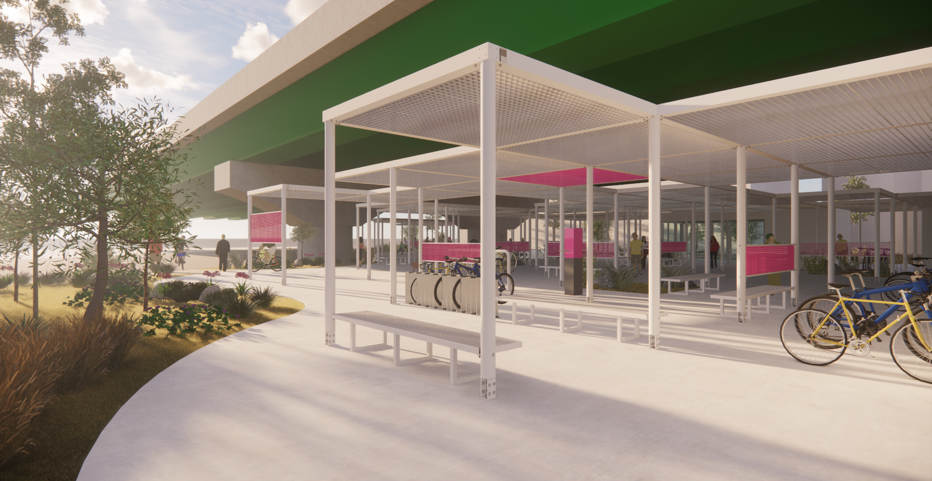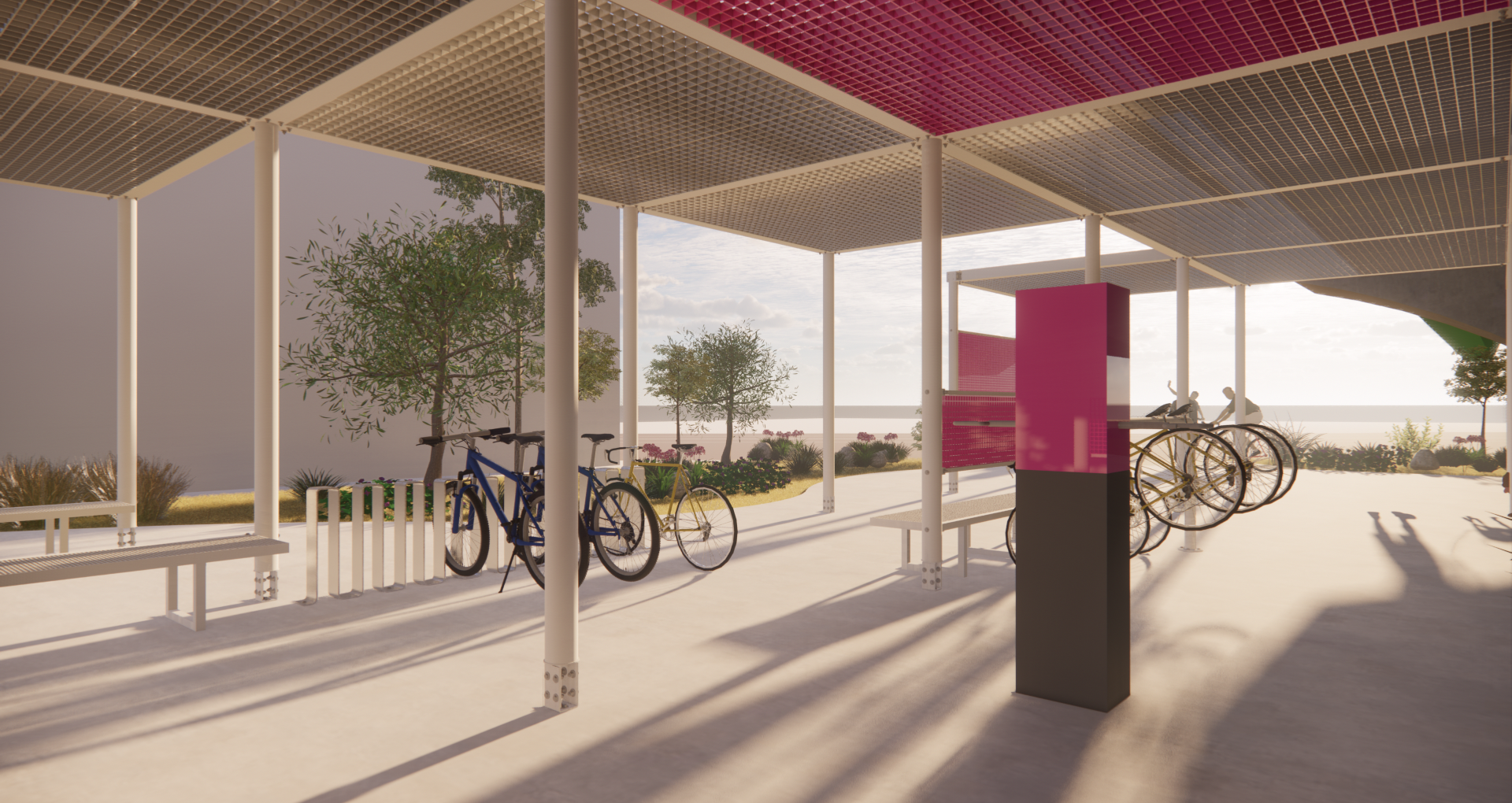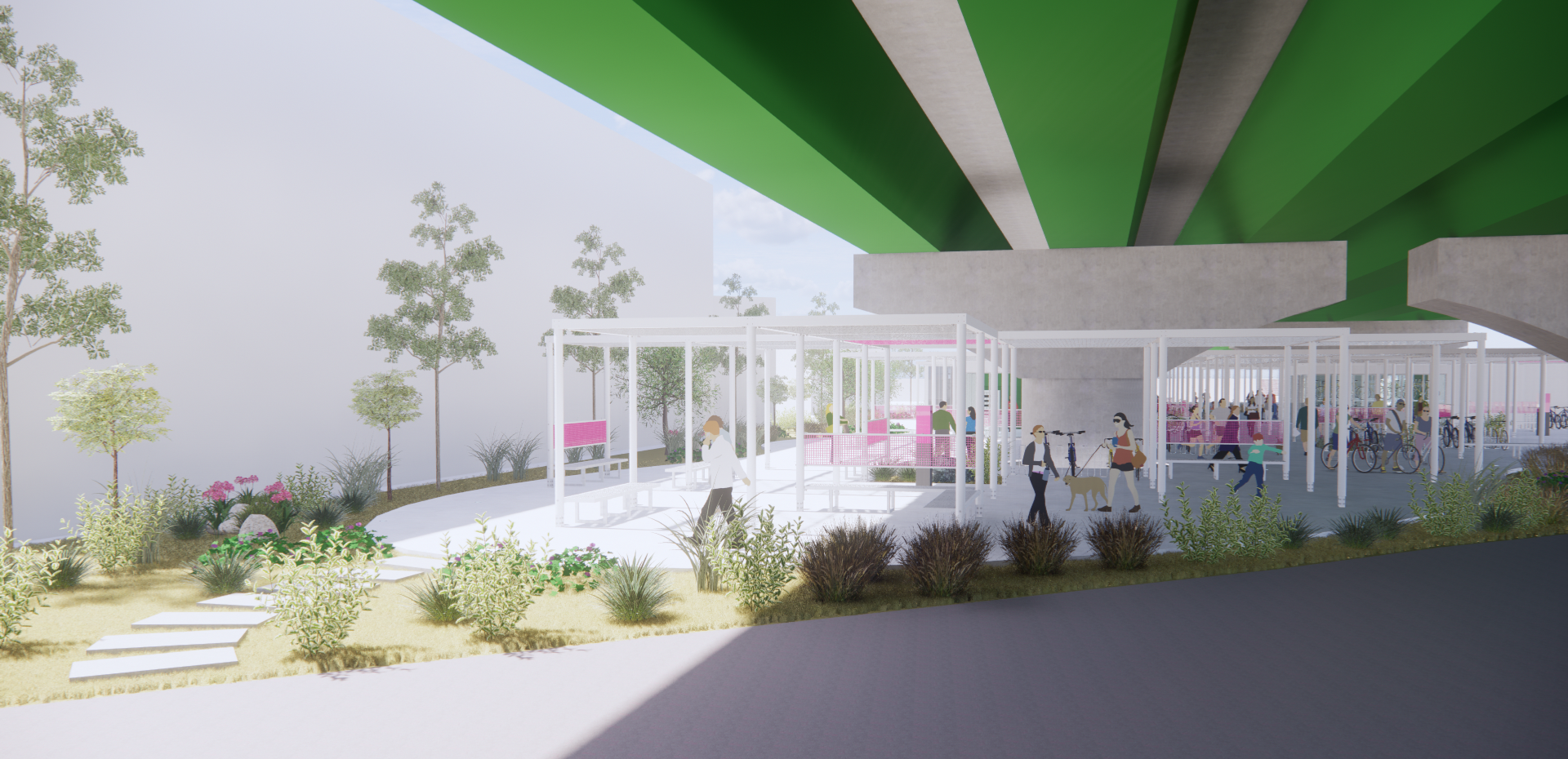 주변과는 다른 공간이라는 이미지, 어두운 고가 하부가 아니라 밝은 공간이라는 이미지가 필요하며, 길 건너 자전거길 이용자들에게도 존재감을 어필하고 이리오라 유혹할 수 있는 이미지로 존재해야 하는 환경의 시설이다.
