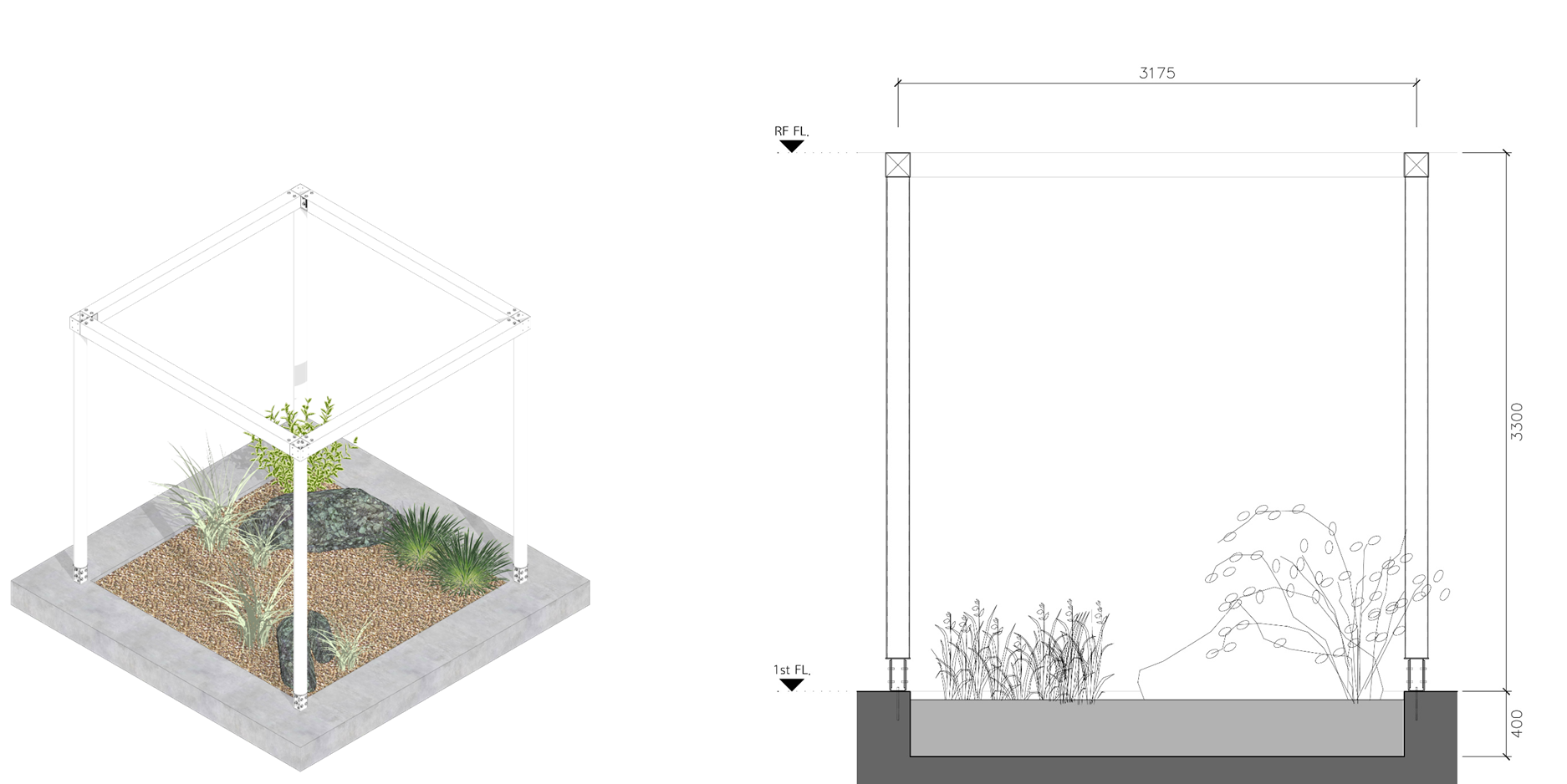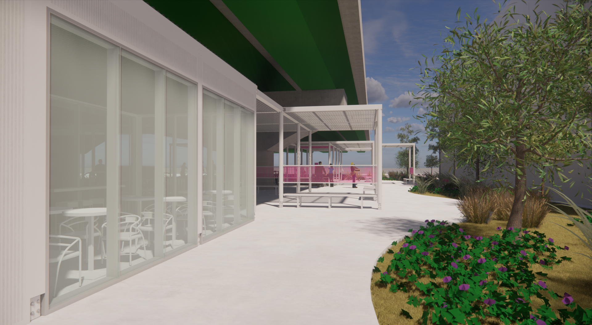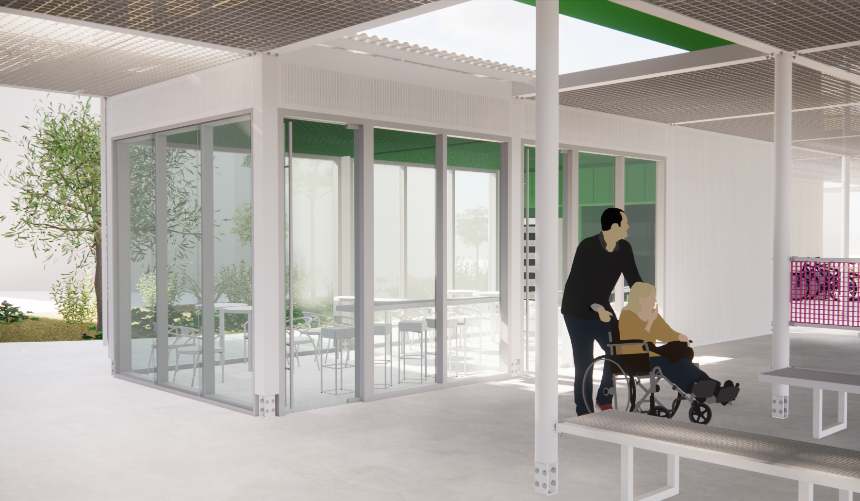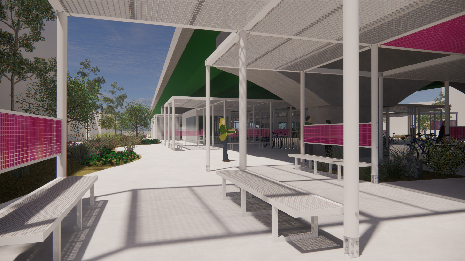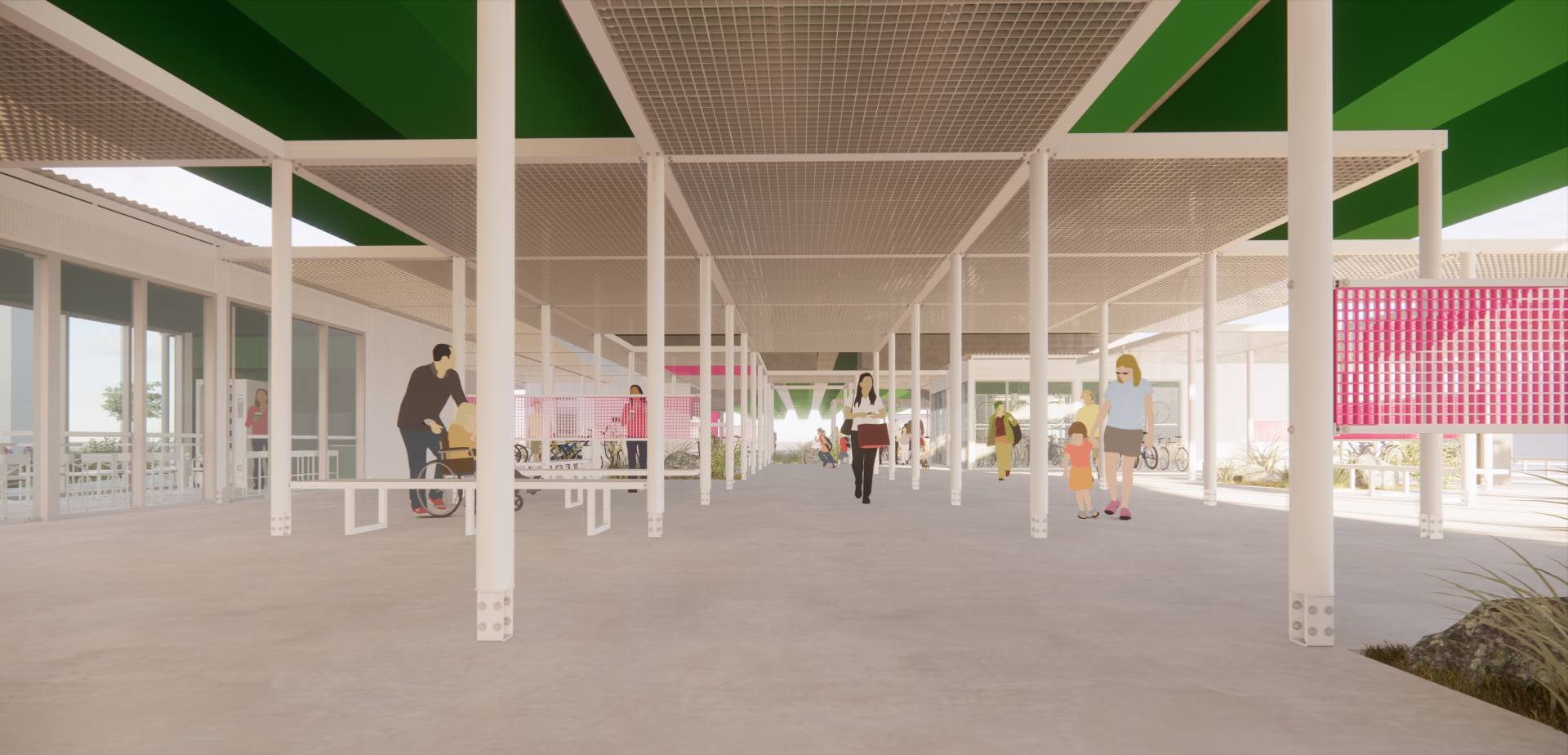 주변과는 다른 공간이라는 이미지, 어두운 고가 하부가 아니라 밝은 공간이라는 이미지가 필요하며, 길 건너 자전거길 이용자들에게도 존재감을 어필하고 이리오라 유혹할 수 있는 이미지로 존재해야 하는 환경의 시설이다.