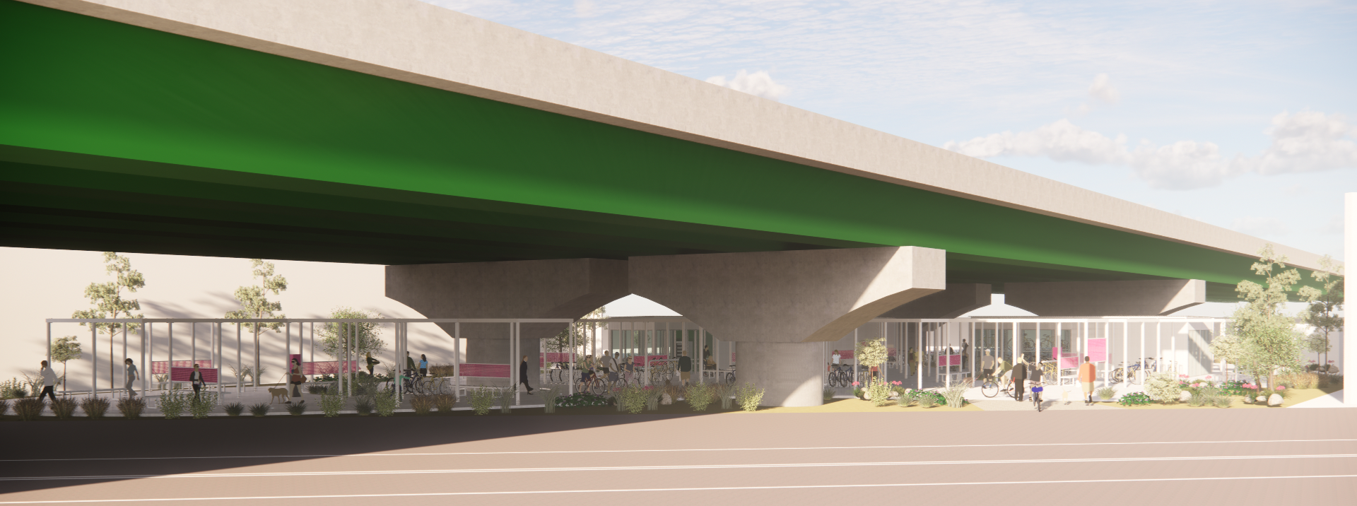 주변과는 다른 공간이라는 이미지, 어두운 고가 하부가 아니라 밝은 공간이라는 이미지가 필요하며, 길 건너 자전거길 이용자들에게도 존재감을 어필하고 이리오라 유혹할 수 있는 이미지로 존재해야 하는 환경의 시설이다.