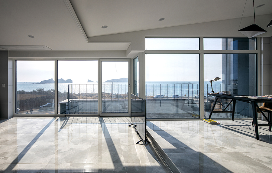 2층은 클라이언트의 주택이다. 프라이버시보다도, 그 무엇보다도 차귀도로의 조망과 열린 느낌을 중요하게 생각한 클라이언트의 요구에 따라 설계했다. 내장재 역시 클라이언트의 취향에 따라 과하거나 너무 튀지 않는 선에서 결정되었다.