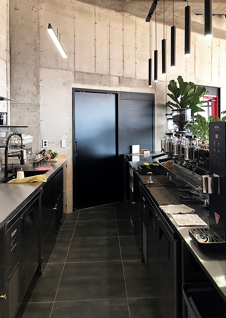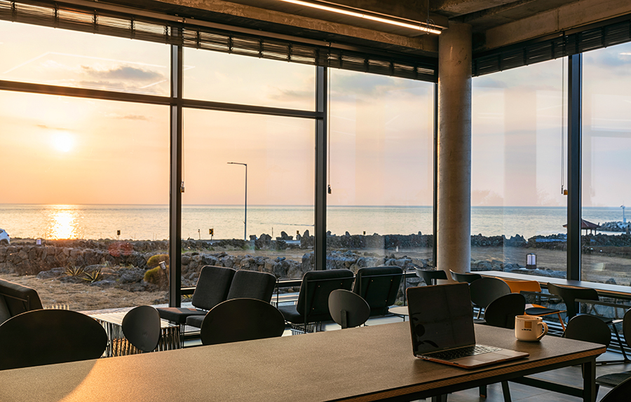 1층은 카페로, 마당 너머 차귀도를 조망할 수 있는 공간이다. 순수한 재료의 느낌을 살릴 수 있는 노출콘크리트와 구로강판, 데스틸의 색상들로 꾸며져 있다.