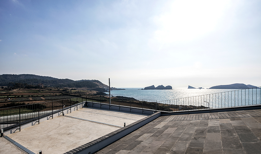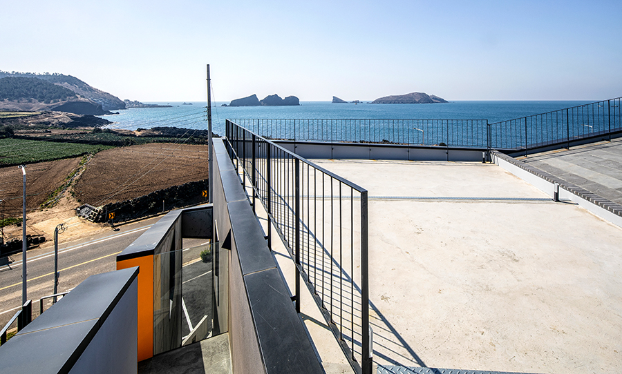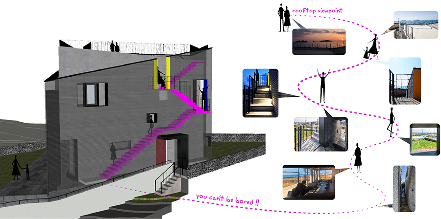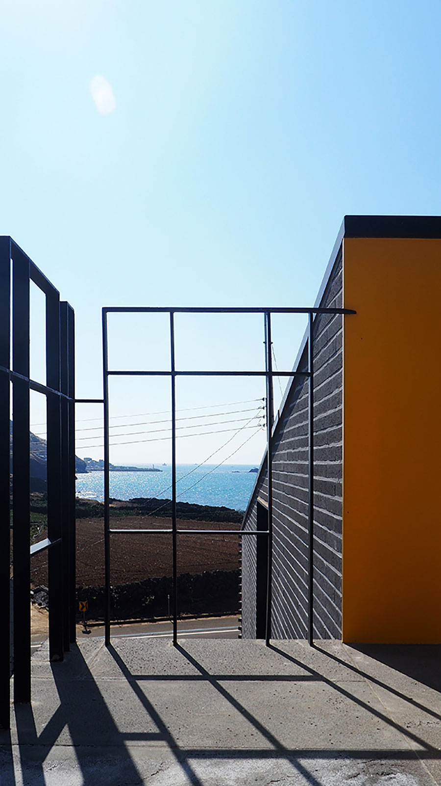 클라이언트가 매우 중요하게 생각한 또 다른 공간은 옥상의 전망을 위한 공간이다. 옥상에서 차귀도와 한라산, 풍차들을 바라보는 풍경은 그에게 매우 중요했지만, 우리에게는 옥상으로 올라가는 길이 더욱 중요했다. 3층까지 올라가는 동안 지루하지 않아야 하며, 2층의 주택을 눈치채지 못해야 한다. 또한 확 트인 옥상에 가기 전까지는 컨트롤된 시선과 전망으로 충분히 즐거워야 했다. 몸을 틀 때마다 새로운 풍경이 펼쳐지고, 고개를 젖히거나 숙일 때마다 전혀 다른 공간감을 느끼기를 바랐다. 갑자기 나타나는 전망창과 어두운 벽 사이를 지나자마자 나타나는 공중계단, 또 한 번 몸을 돌렸을 때 보이는 아래의 계단과 바다가 충분히 다이나믹한 공간감을 만들어주기를 기대했다.
