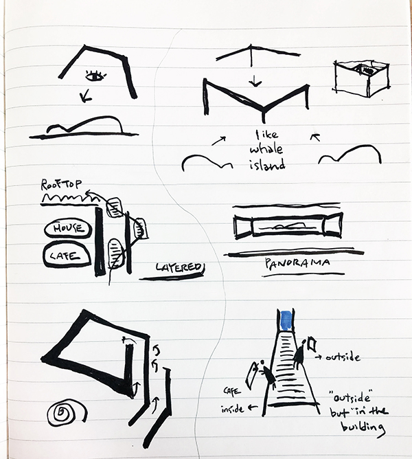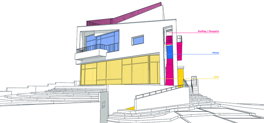 이 풍경들을 다 경험하게 하고 싶었다. 그래서 처음에는 땅 위에 펼쳐진 구조물을 상상했지만, 정해진 건폐율은 20%, 건물의 높이는 10미터로 제한되어 있었고 예산도 넉넉지 않았다. 클라이언트 역시 너무 긴 동선과 펼쳐진 건축물은 원치 않았다. 하지만, 건물로 들어서는 시퀀스는 진입 램프로 그 흔적이 남았고, 다양한 방향으로의 풍경은 옥상 전망공간으로 올라가는 계단을 통해 경험하도록 했다. 클라이언트는 데 스틸을 원했지만 구성주의의 색상과 디자인을 확실하게 따르는 디자인도 원치 않았기 때문에, 빨강, 노랑, 파랑과 검정 등 데스틸의 색상을 곳곳에 포인트로 사용하기로 했다.