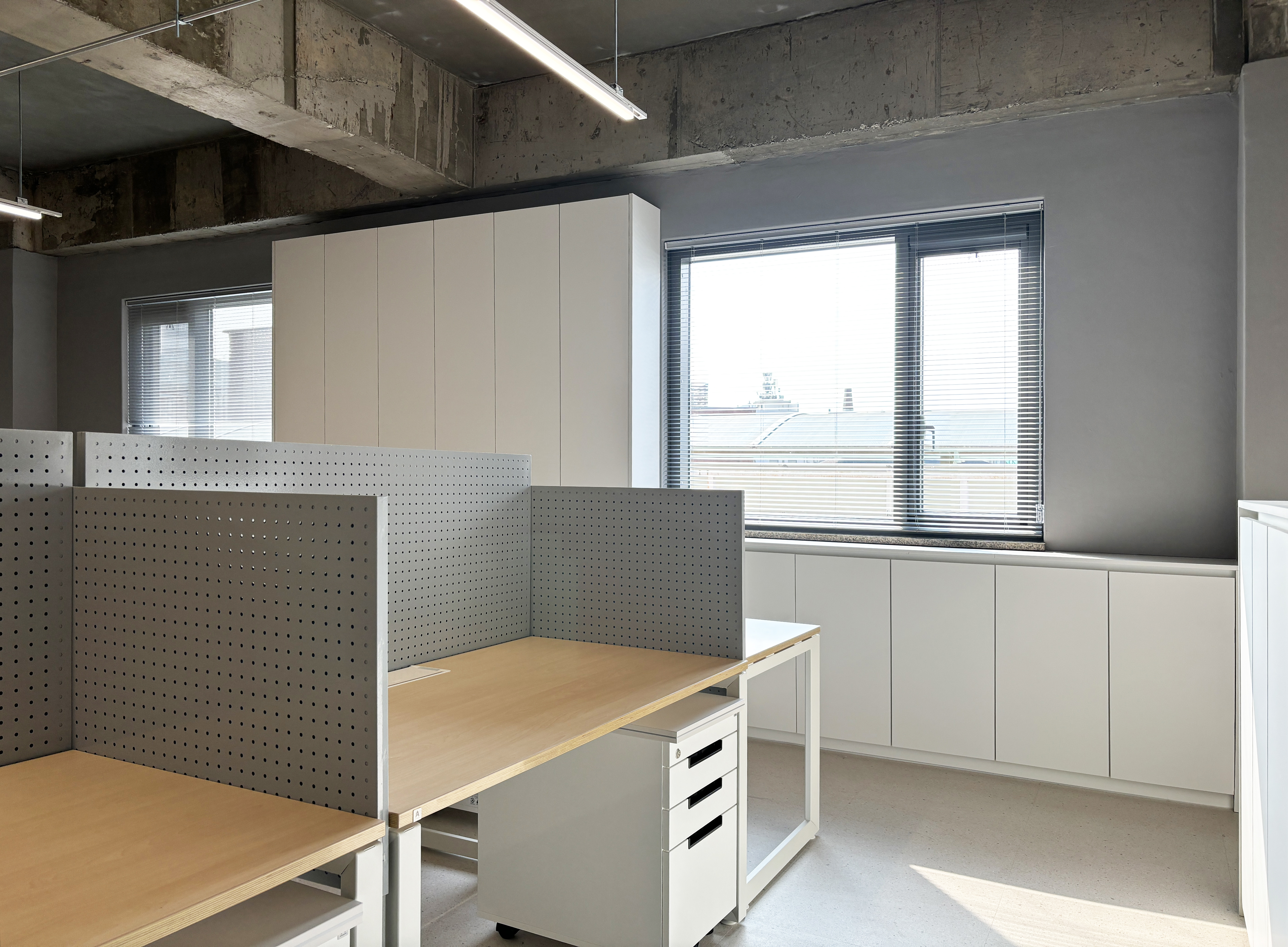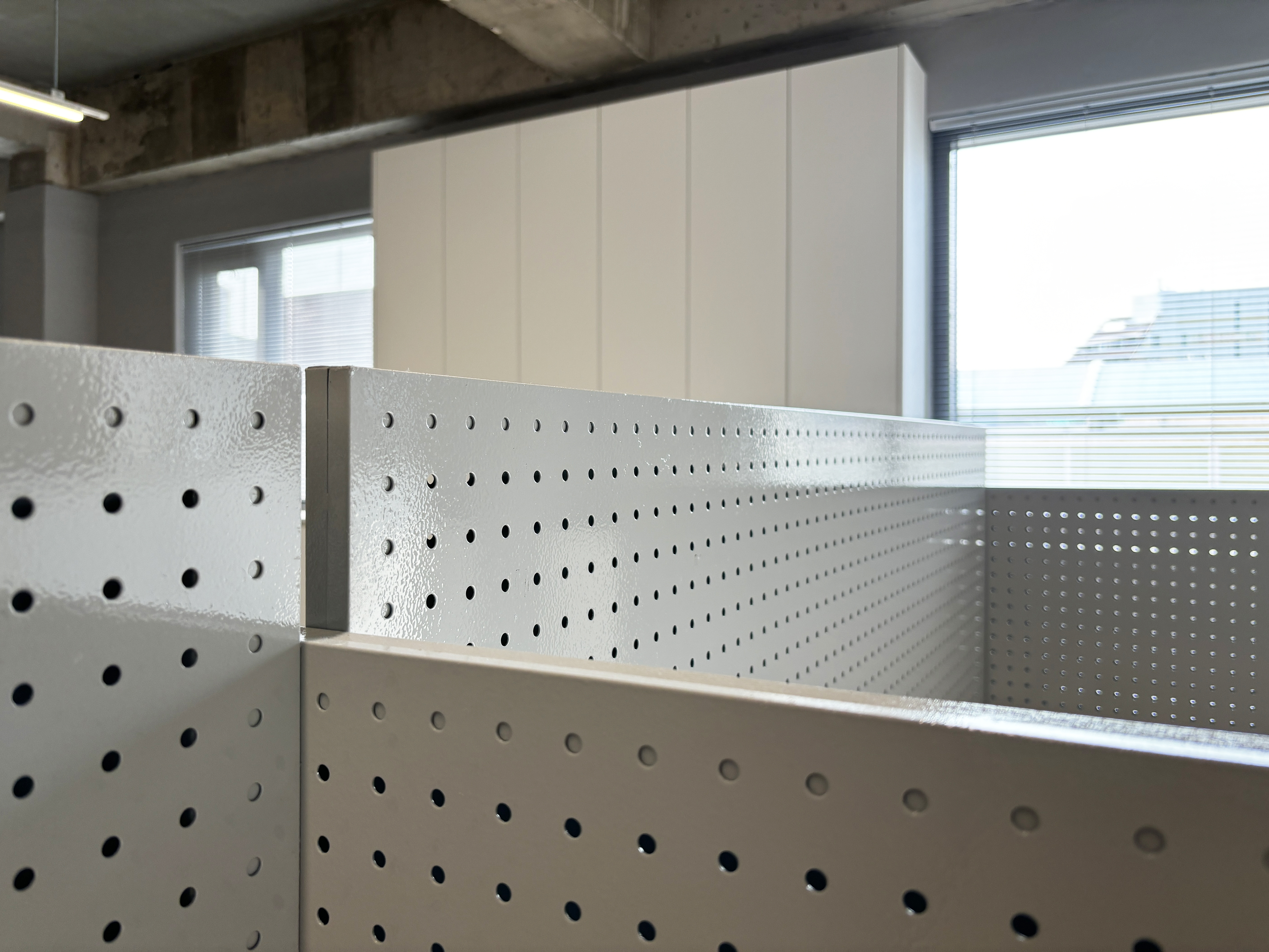 + 깔끔하고 정돈된 업무공간을 연출하기 위하여 파티션을 디자인해 제작했다. 활용도가 높은 철제타공판을 사용했다.