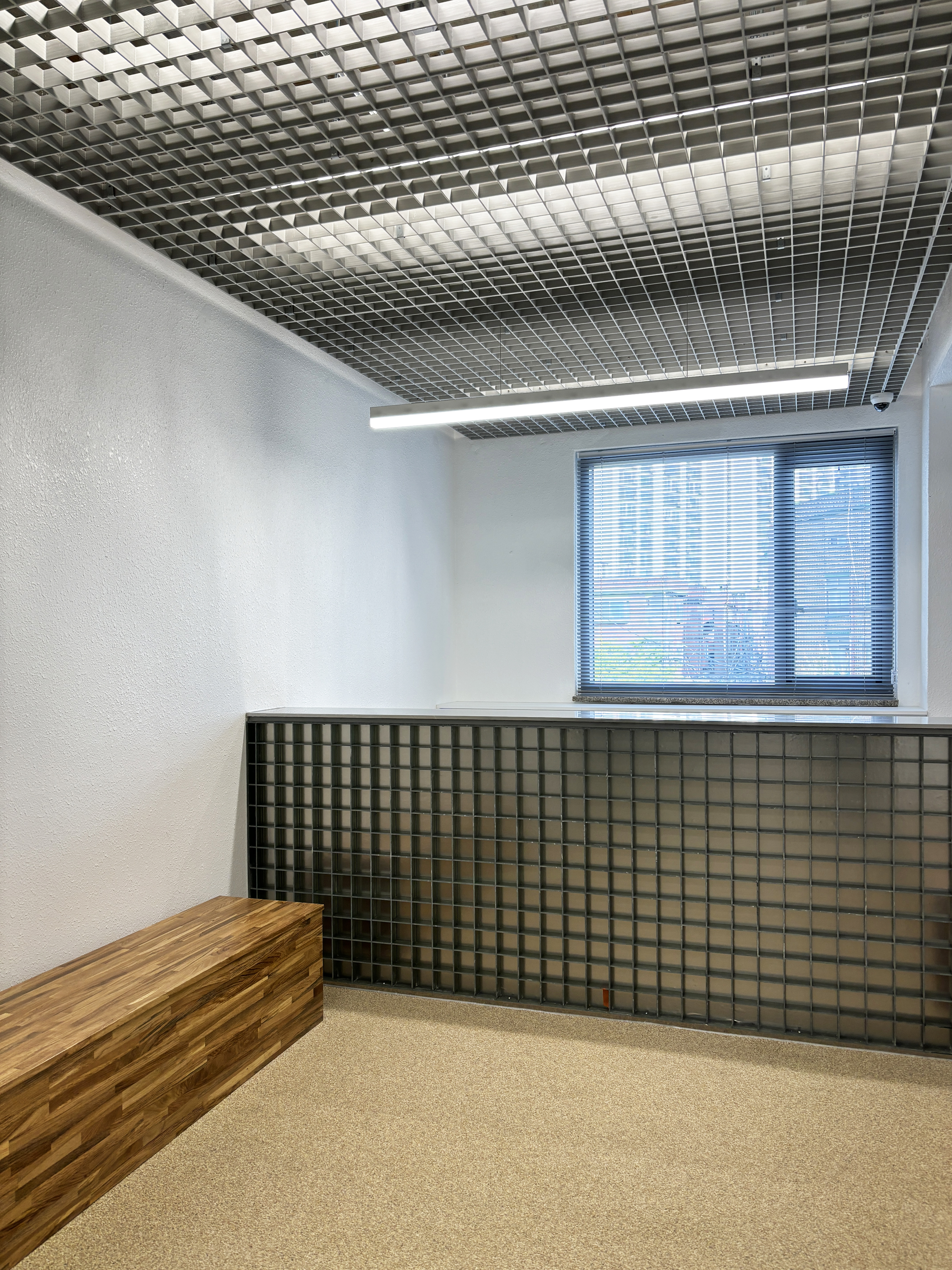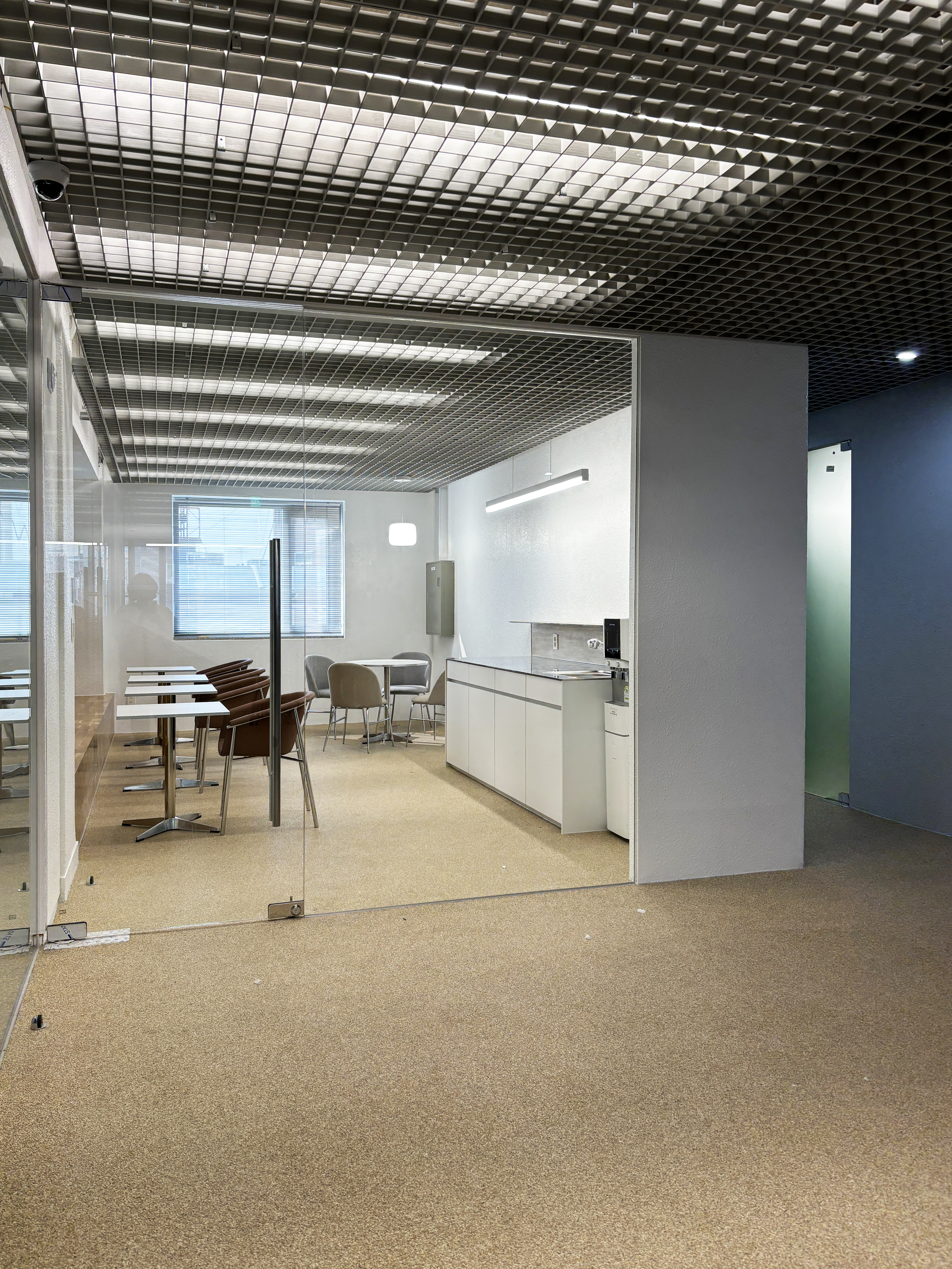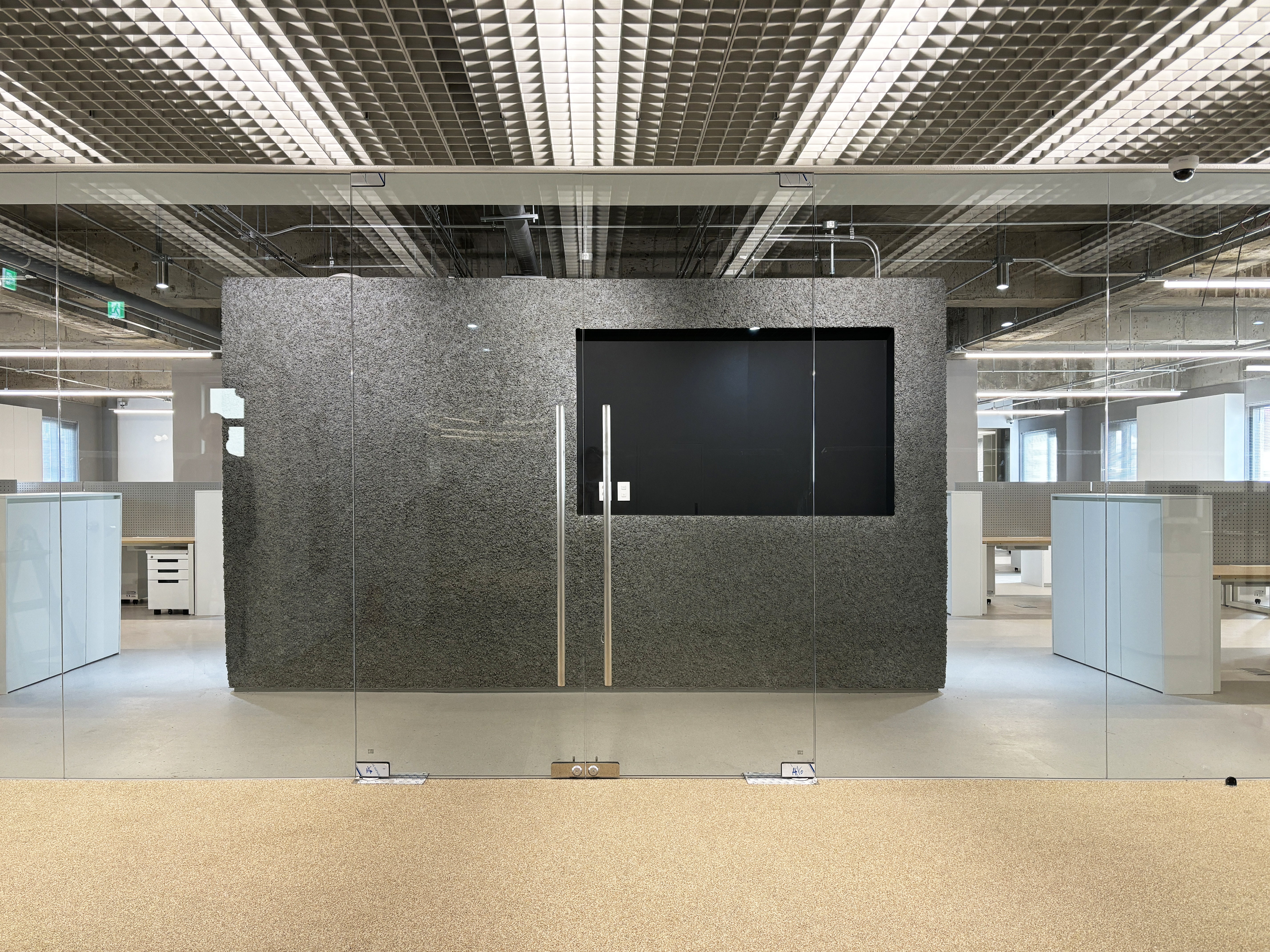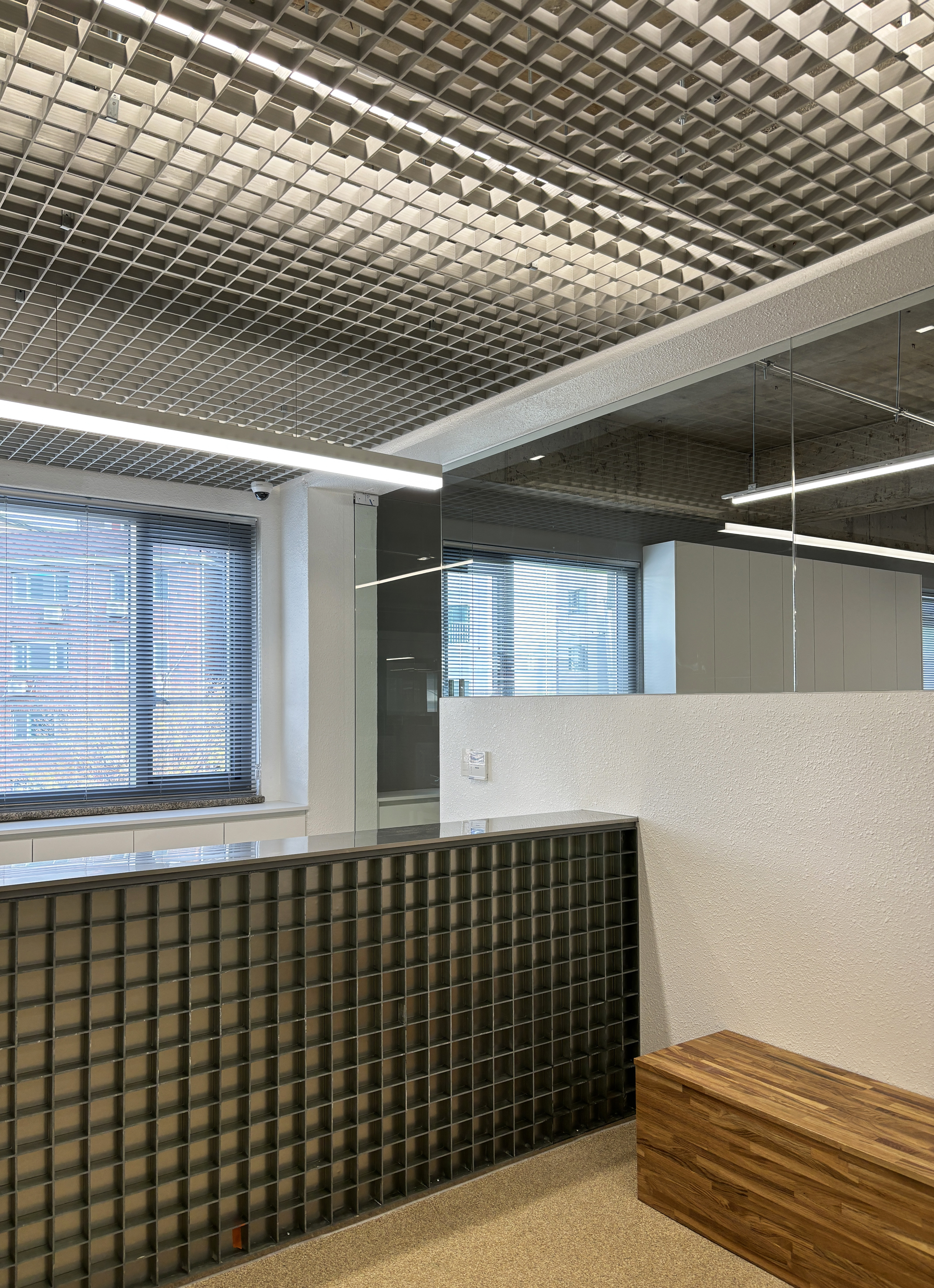 + 공용공간 천장재인 FRP Grating은 천장의 복잡한 배관들로 향하는 시선을 필터링해 차분하게 해주면서도