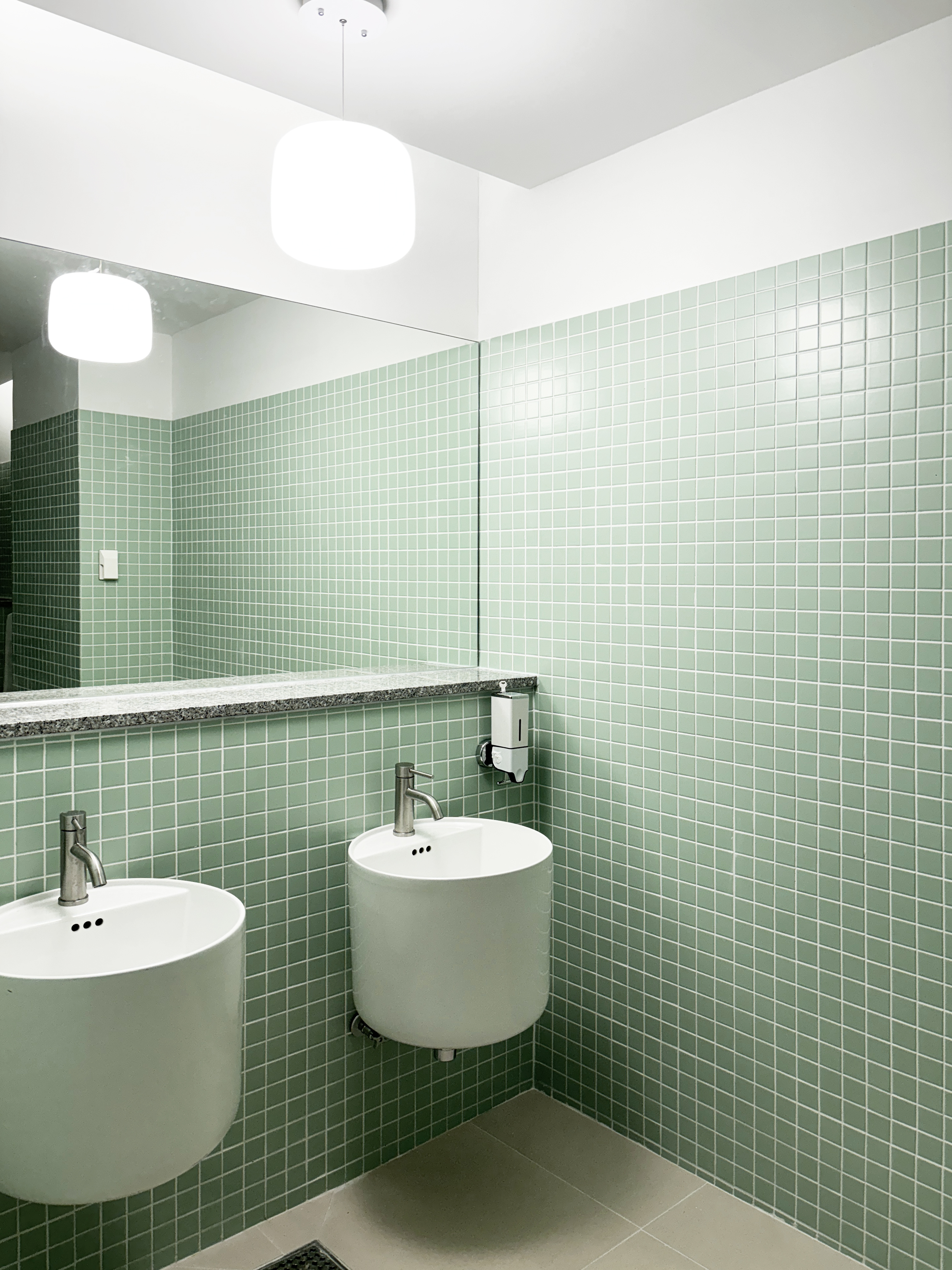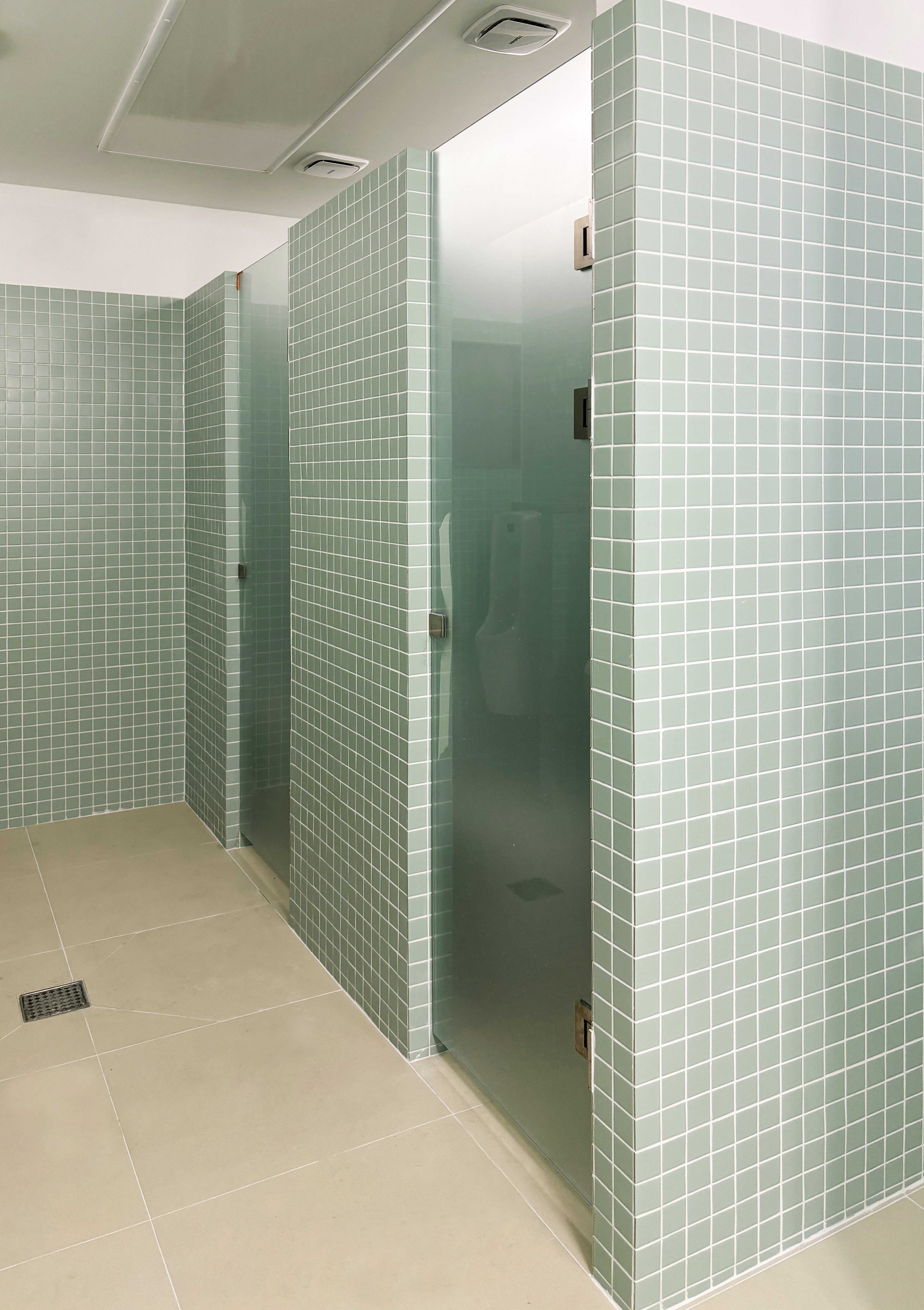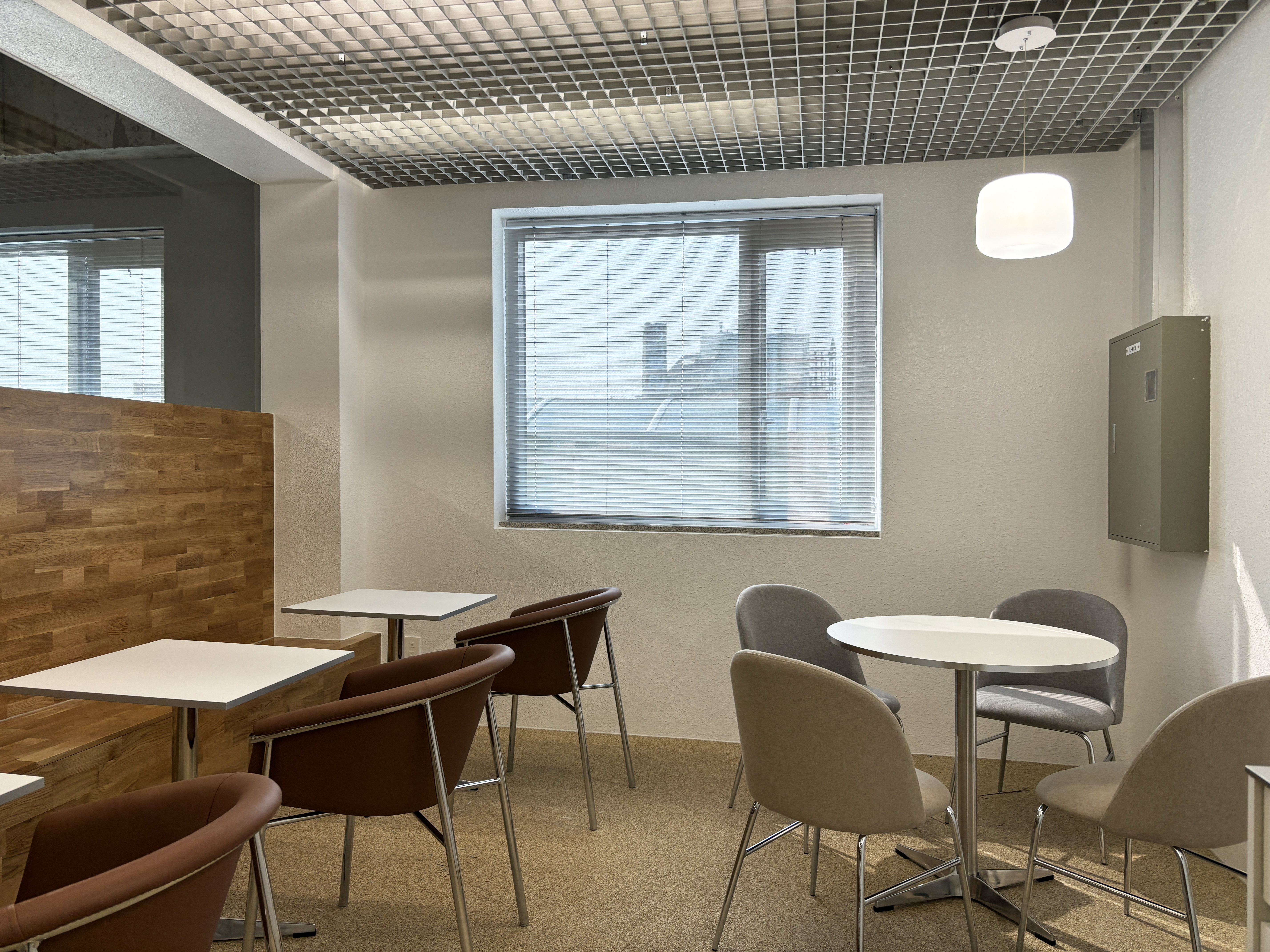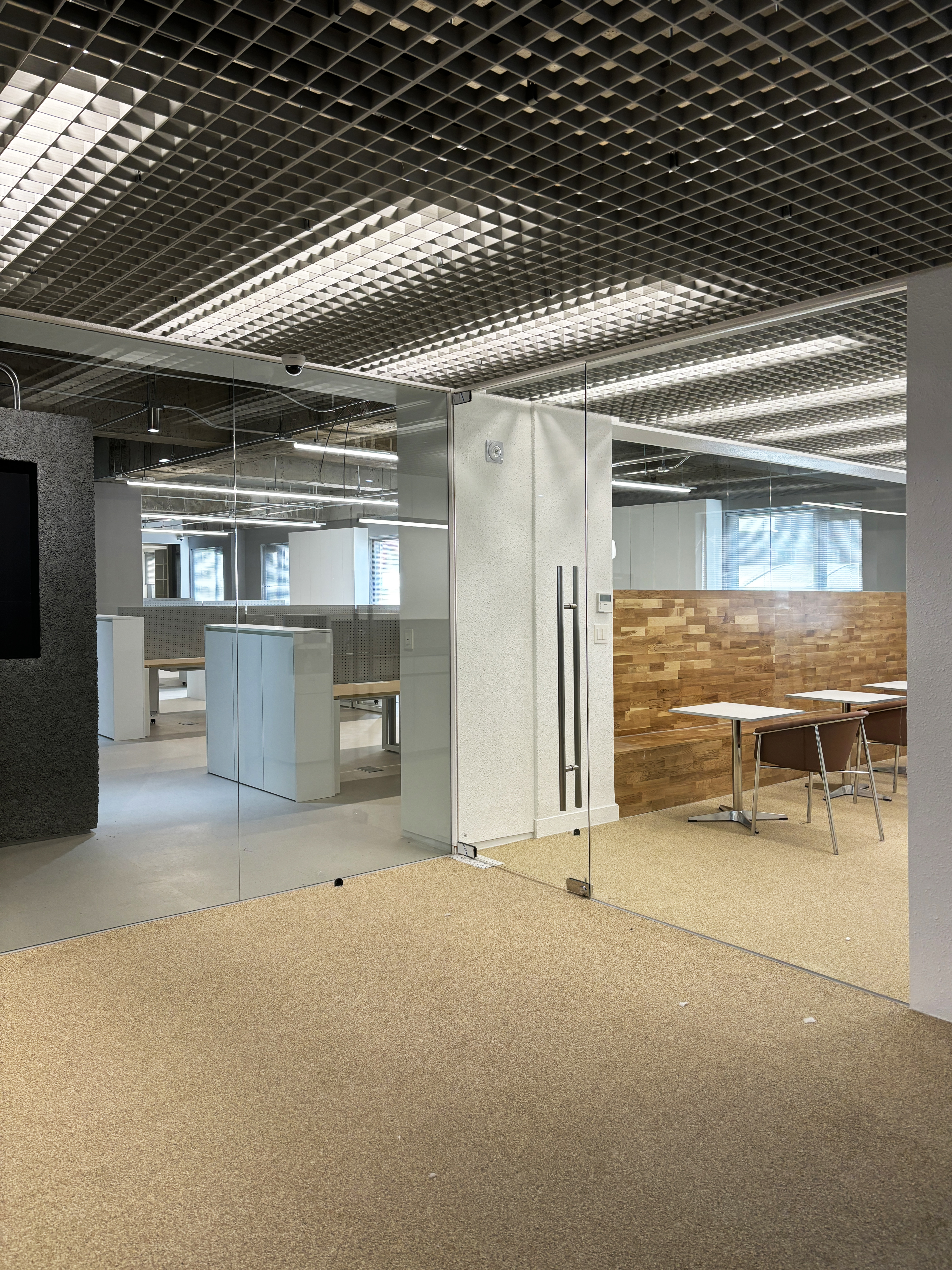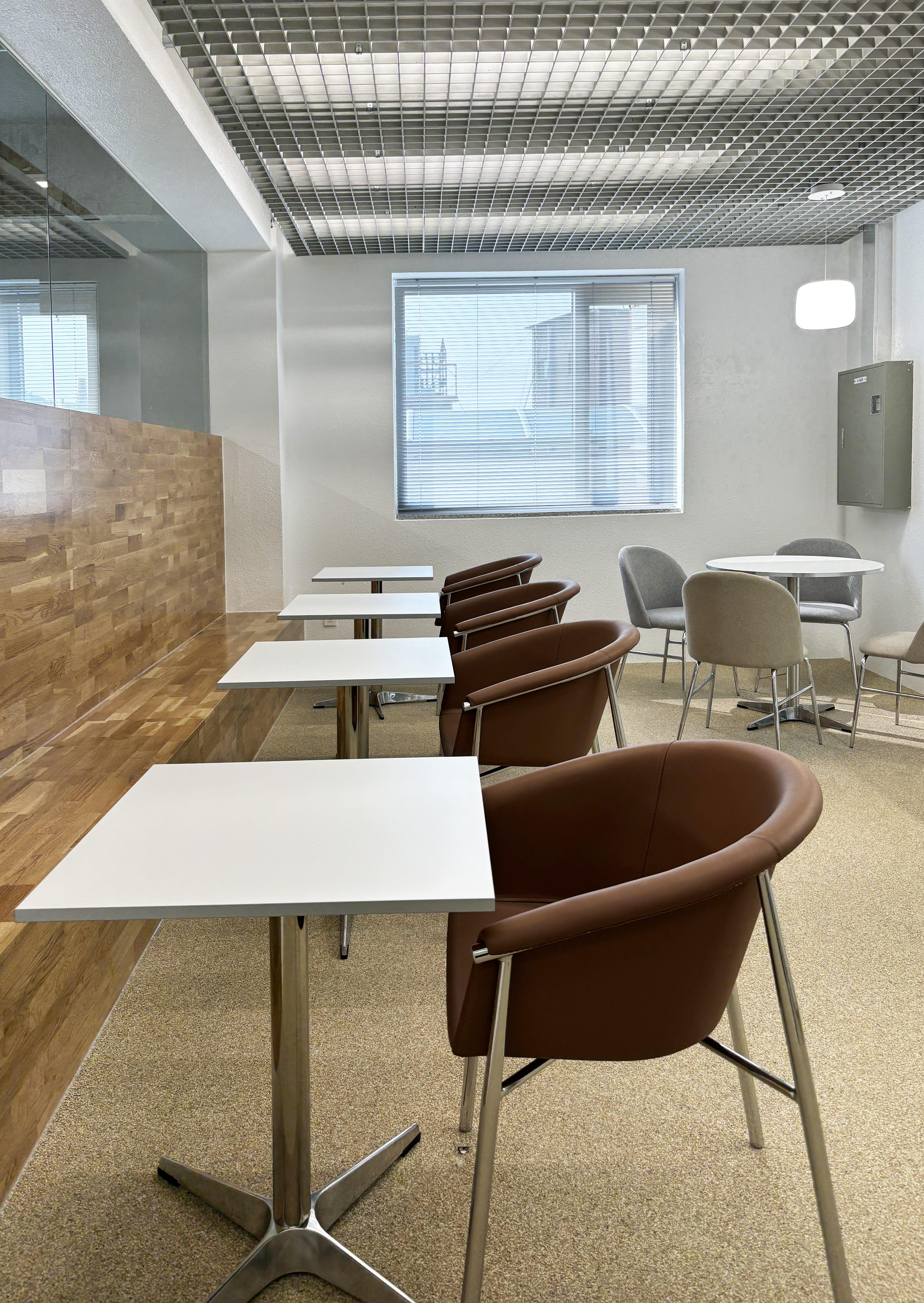 + 공용공간 천장재인 FRP Grating은 천장의 복잡한 배관들로 향하는 시선을 필터링해 차분하게 해주면서도