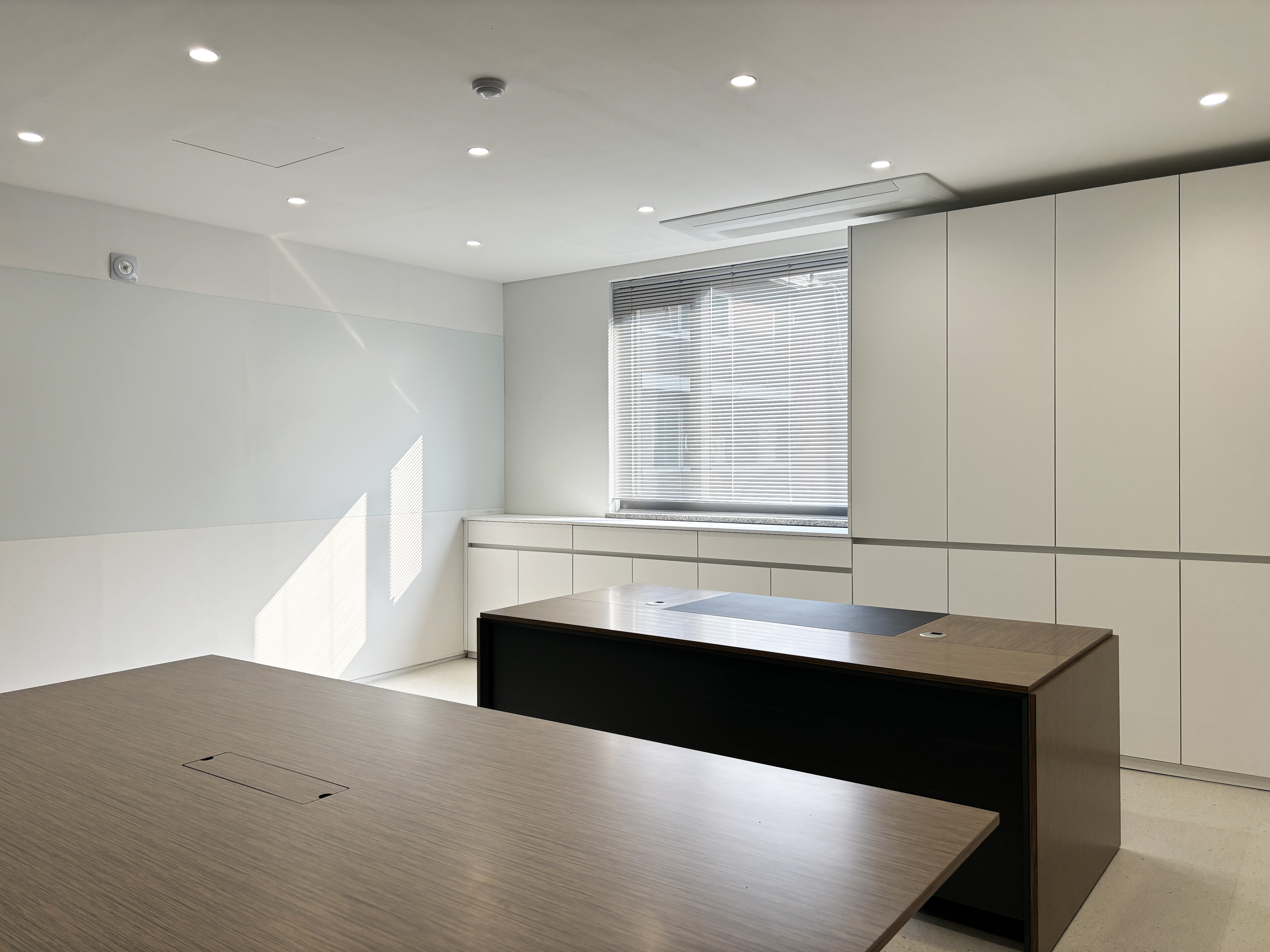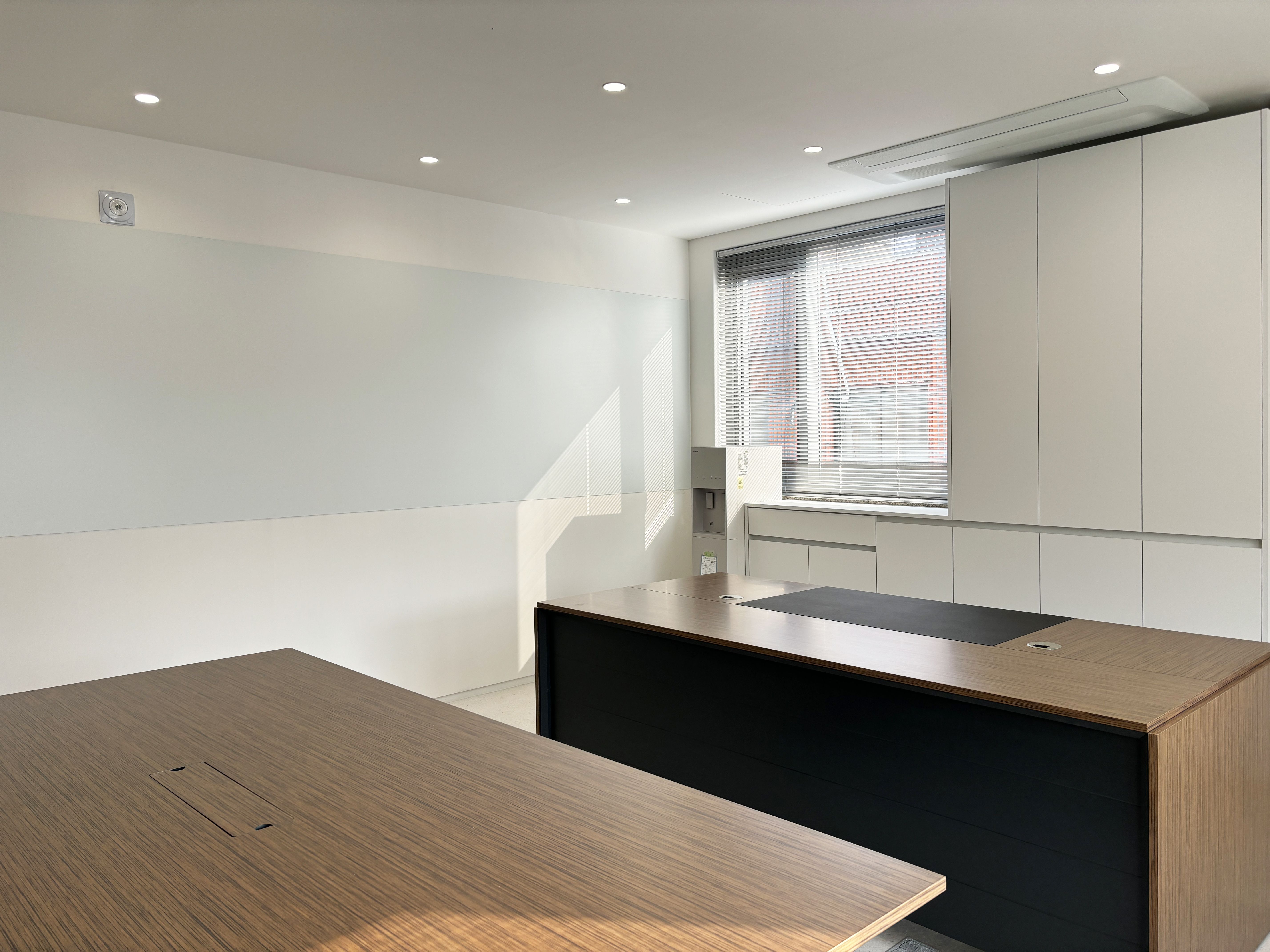 임원실의 한쪽 벽은 마감을 달리하여 벽 자체를 화이트보드로 사용할 수 있도록 했다.