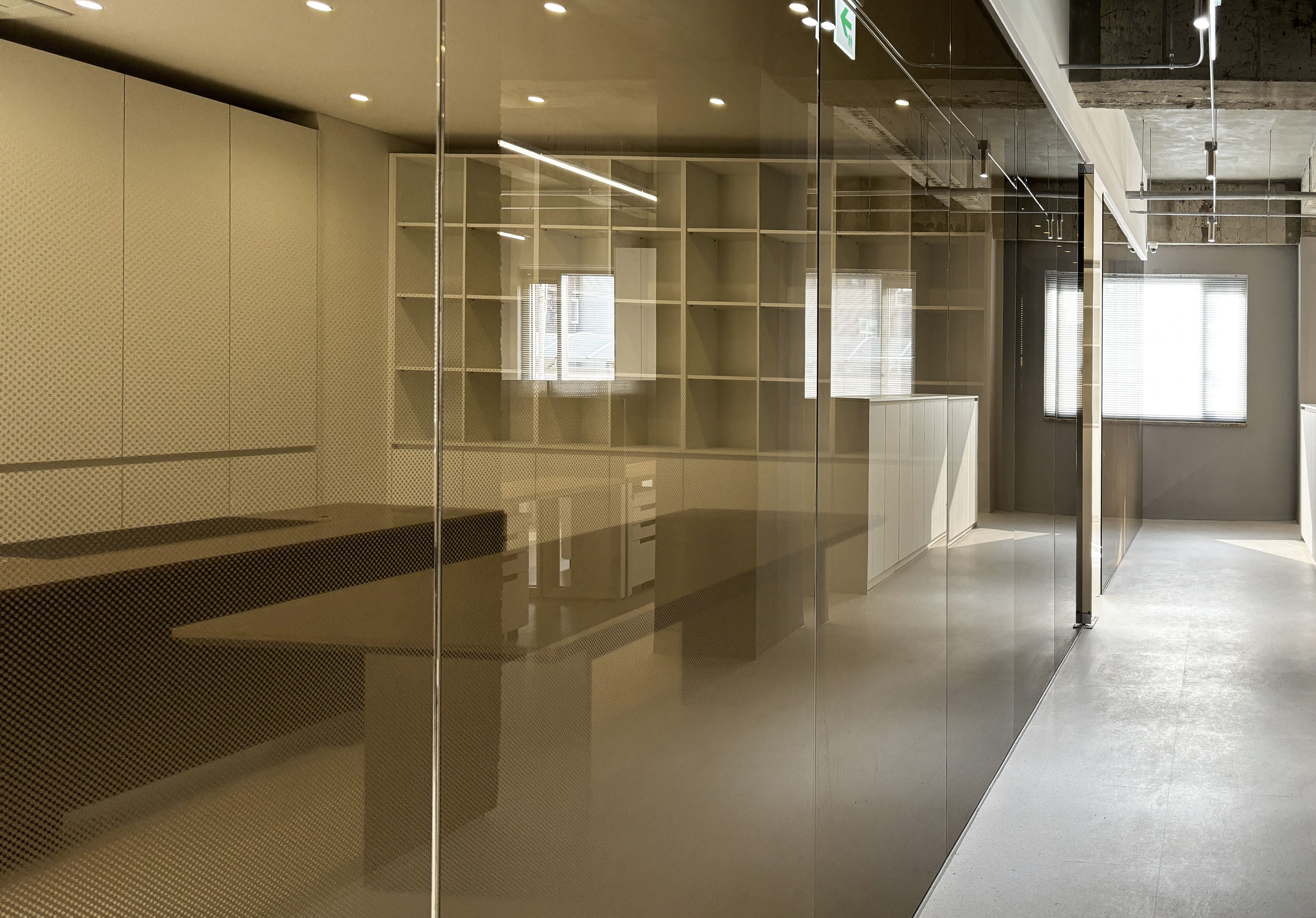 + 임원실의 벽은 답답하지는 않되 시선을 살짝 걸러주기 위해 브론즈 유리에 그라데이션 시트를 부착했다.