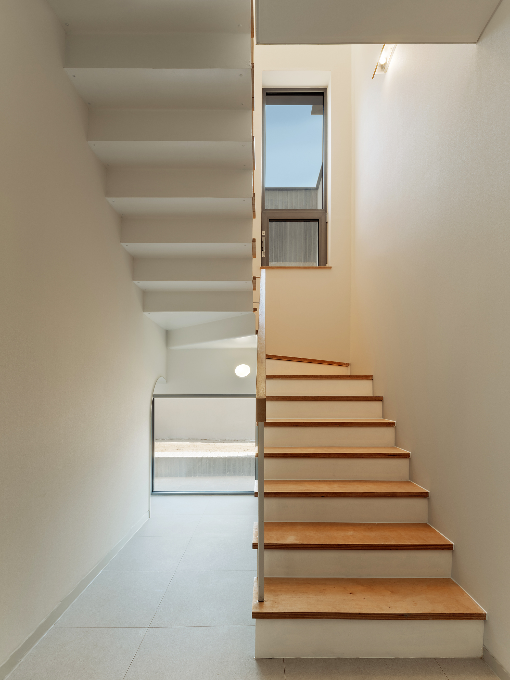거실과 계단 사이, 중앙의 벽은 한국인이라면 누구나 알 수 있는 용도의 벽입니다. TV를 위한 벽이지요. 그리고 그 왼쪽 아래 작은 개구부와 바닥의 창은 이 집의 실세, 고양이 깨비를 위한 통로이고 창입니다. 가족과 연결된 이 통로는 깨비에게 안정감을 줄테고, 그 옆 창은 계절따라 바뀌는 풍경들이 장난감이자 TV가 되어 깨비에게 즐거움을 줄 터입니다. 벽 뒤 계단 아래에는 사람들의 시선이 직접 닿지 않는, 깨비의 프라이빗한 화장실이 있습니다. 늘 깨비를 염려하는 가족들의 안도는 덤입니다.