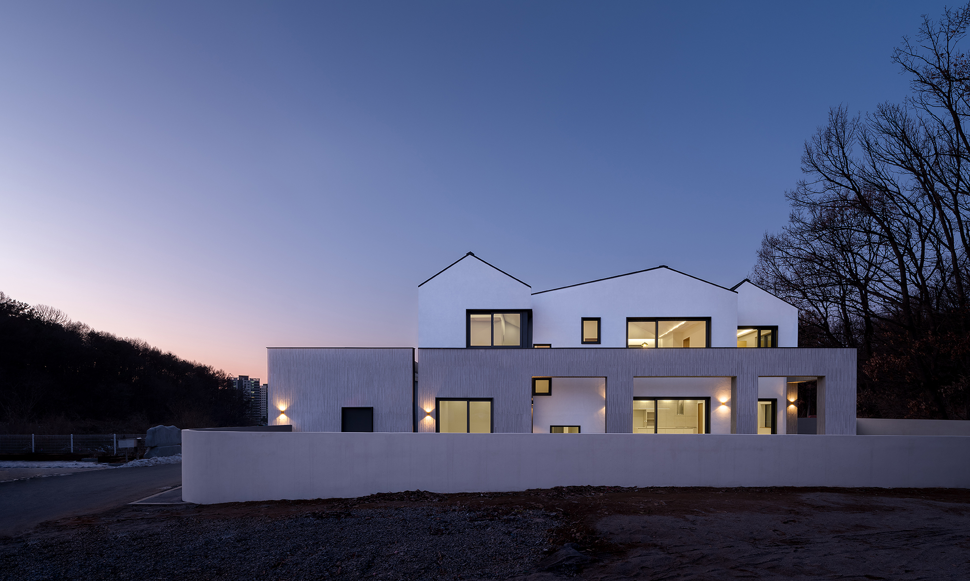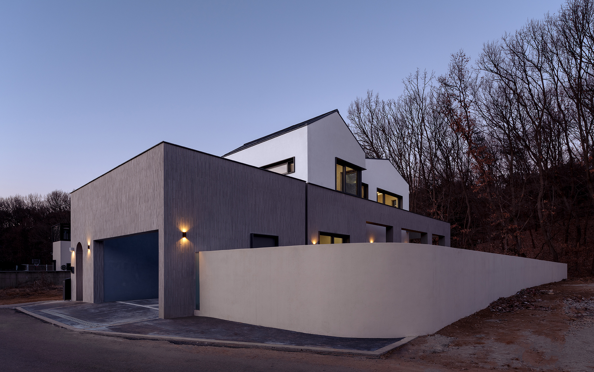 가족들이 머무는 실내공간은 보드라운 흰색 벽들로 감싸져 있고, 그 바깥으로 회색 벽돌 벽이 듬직하게 집을 한 겹 더 감싸고 있습니다.