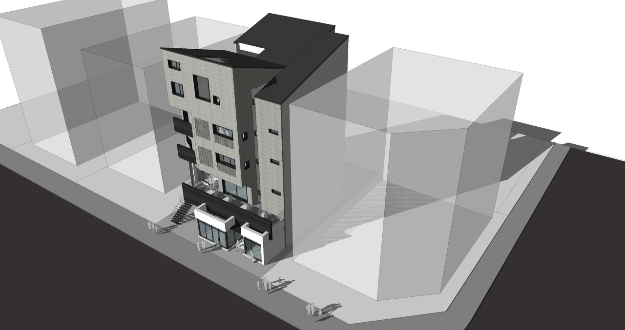 각 층의 프로그램에 따라 조금씩 다른 테라스를 필요로 합니다. 특히 2층(아마도 카페)과 5층 주거 공간은 조금 더 다른 테라스 공간을 필요로 하지요. 그리고 3~4층의 경우에도 전면이 남향이라 사무실이지만 전면에서의 채광이 필요합니다. 각기 다른 테라스 공간을 전면의 벽으로 정리해주었습니다. 또한 적절히 투명도를 조절한 이 벽은 내부로 향하는 외부의 시선을 걸러주는 역할도 합니다. 5층 주거의 경우 절대적으로 필요한 것이었습니다.